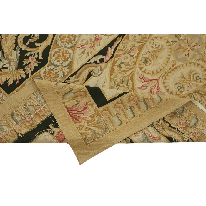 The Aubusson Rug is 273 cm wide by 337 cm long and about 5 mm thick. It weighs an average of 10 kg. It is made with hand-spun wool and cotton. It takes its colors from root dyes obtained naturally.