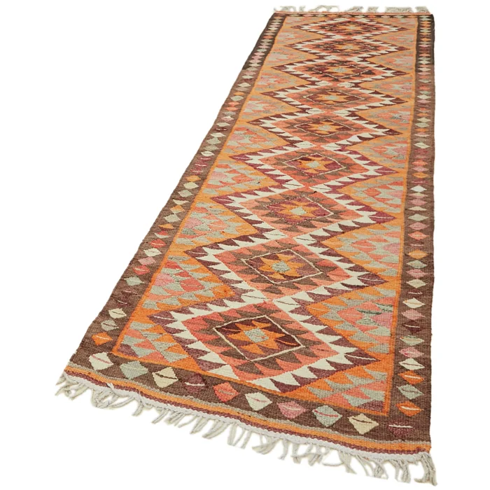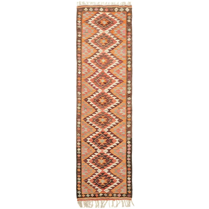 Herki Kilim Rug 101 cm width and 321 cm length and the pile height is 5mm, the approximate weight of the rug is 8 kg. It’s % 100 hand knotted wool and goat hair rug. It’s made from the natural dye.