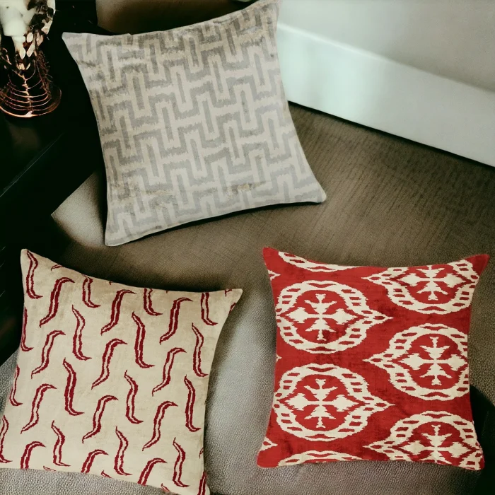 These exclusive silk velvet pillowcases are made from traditional Ikat fabrics, each carefully crafted by hand by experienced Turkish artisans. The patterns on these covers, in which traditional techniques are skillfully used, are not prints, but original motifs woven one by one. In this way, each product has its own unique and unique design. These decorative pillowcases are offered in four useful sizes to adapt to different living spaces: 40 x 40 cm, 50 x 50 cm, 60 x 60 cm, 40 x 60 cm Hidden zippers are used in pillowcases. The product is only pillowcase, the inner pillow is not included.