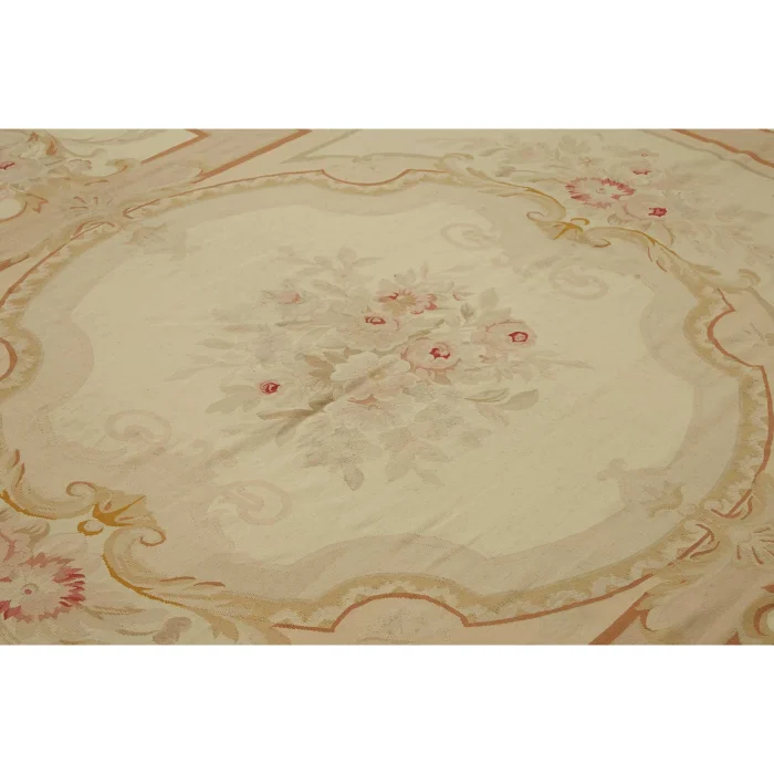 The Aubusson Rug is 308 cm wide by 397 cm long and about 5 mm thick. It weighs an average of 13 kg. It is made with hand-spun wool and cotton. It takes its colors from root dyes obtained naturally.