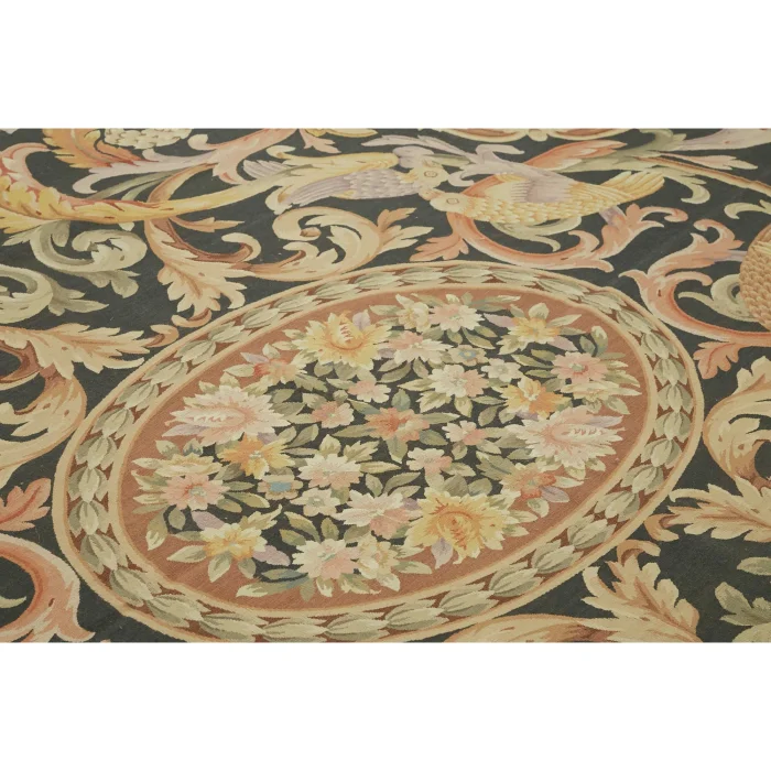 The Aubusson Rug is 296 cm wide by 426 cm long and about 5 mm thick. It weighs an average of 14 kg. It is made with hand-spun wool and cotton. It takes its colors from root dyes obtained naturally.