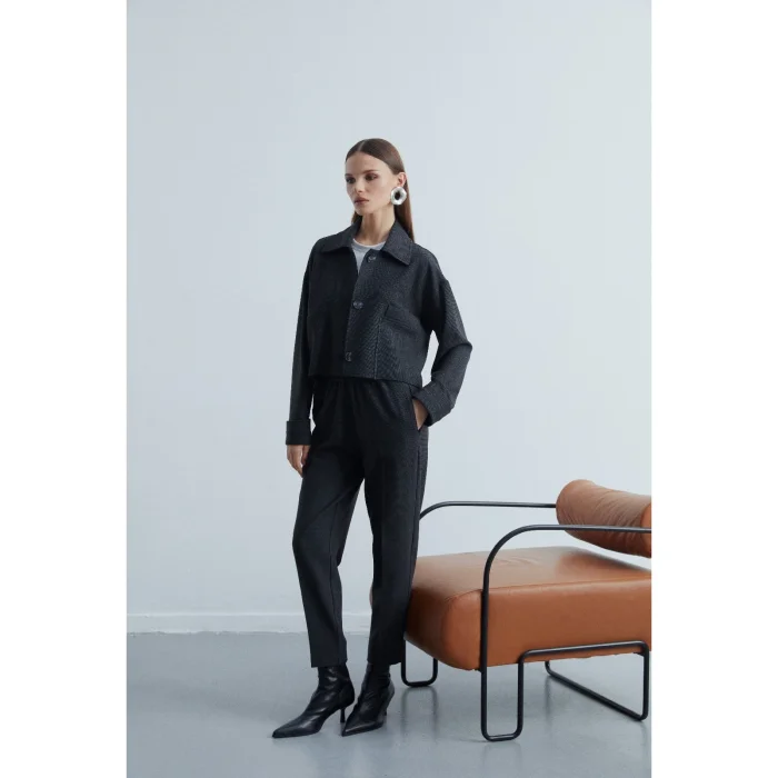 Product: Timeless Elastic Waist Pipe Leg Textured Trousers