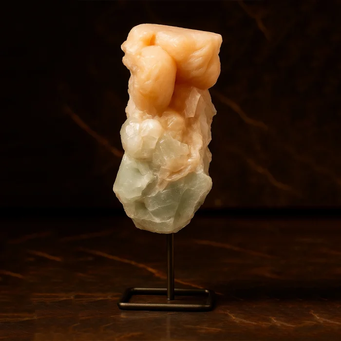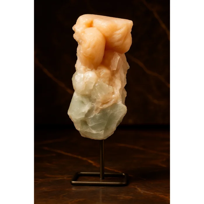 Zeolit’in gözenekli yapısı ve kristal detayları, bu özel formda şık bir stand ile birleşerek yaşam alanınıza doğal bir denge ve estetik kazandırır.