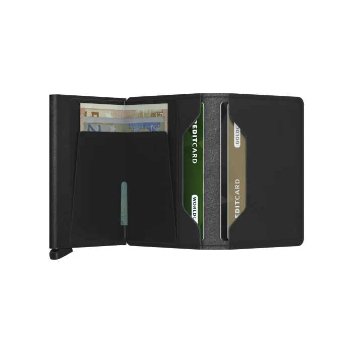 Secrid Slimwallet is similar to Miniwallet but without a snap closure and is thinner. The Slimwallet fits easily into the breast pocket of a jacket. The Slimwallet skin is cut wider than the Miniwallet skin. This offers space for extra cards, receipts, business cards, and receipts. Slimwallet is not very suitable for coins. It has a capacity of 4 embossed cards or 6 plain cards. 4 extra cards 4 extra cards Banknote Business cards Income. 65 x 102 x 21 mm