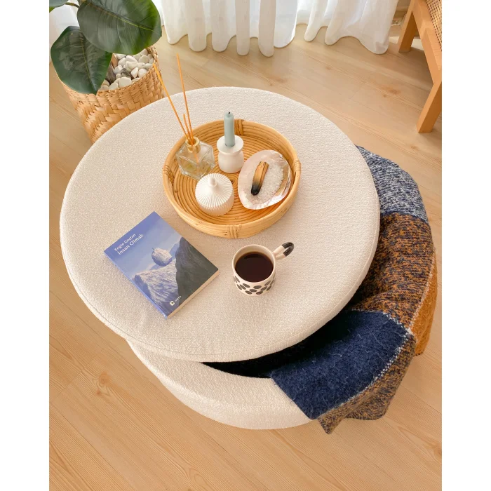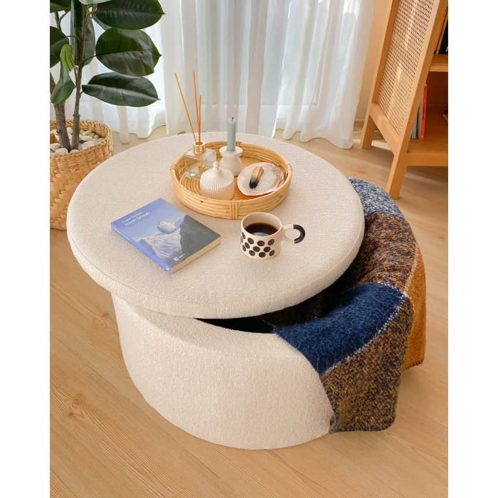 This versatile product, which can be used as both a coffee table and a pouf, adds comfort and practicality to your seating area. Thanks to its hidden storage space, it helps you keep your belongings organized.