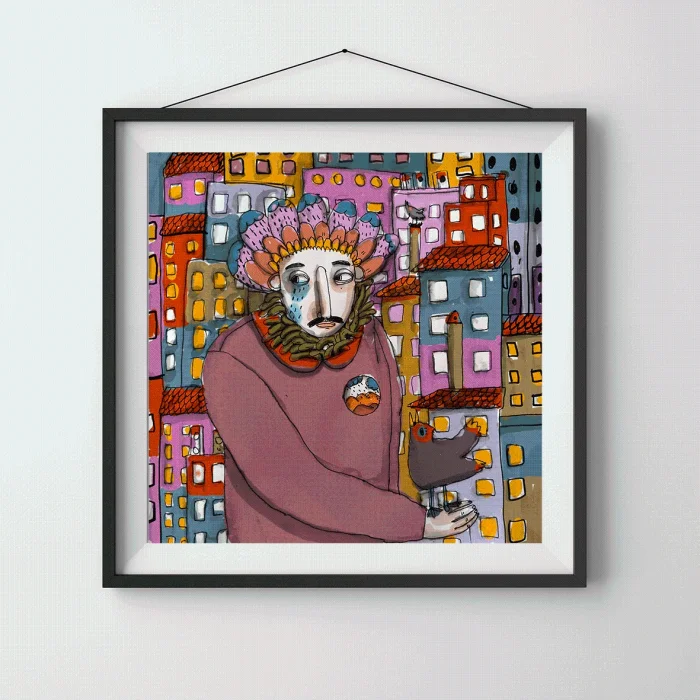 Drawings made with markers, dry and watercolors, then printed in giclée quality on 210g matte Hahnemühle enhanced paper. This technique; Art printing can capture 98% of the original colors, and these colors are preserved for about 200 years in a healthy way. *Will be sent by roll without frame. *Print size is 29x29. *Frame allowances are given extra. *Not dimensioned