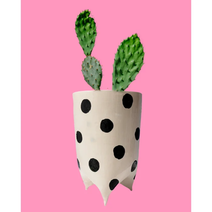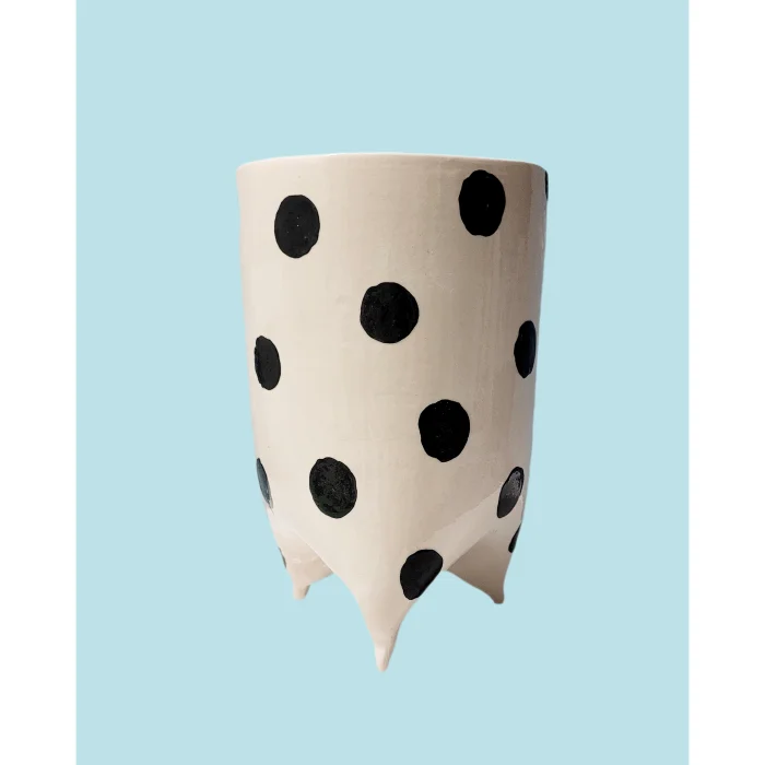 Cute, ceramic, hand-shaped and decorated pots of different sizes, polka dots, stripes, legs.