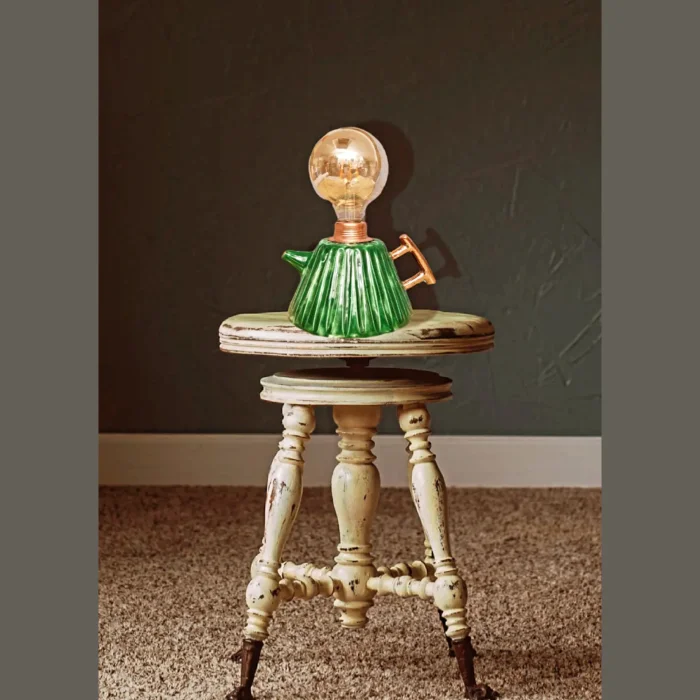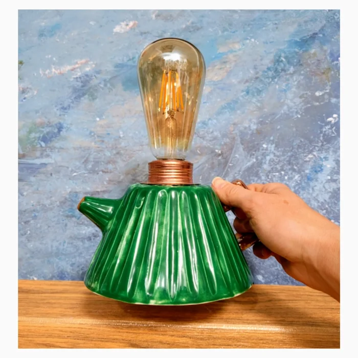Teapot-shaped, vibrant green, completely handmade and hand-painted, ceramic lighting, decorative table, bedside lamp, decorative lighting object.