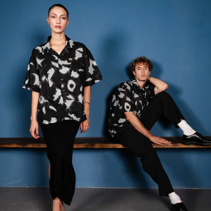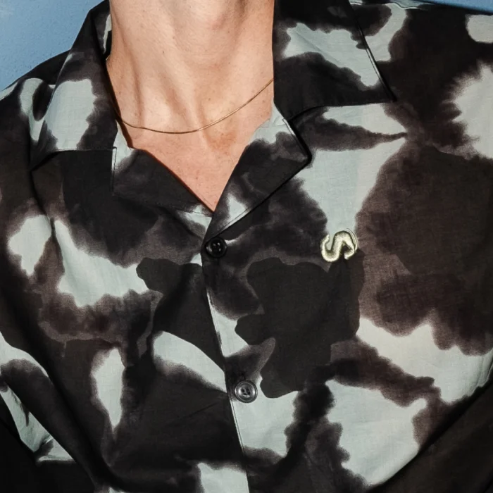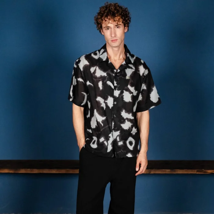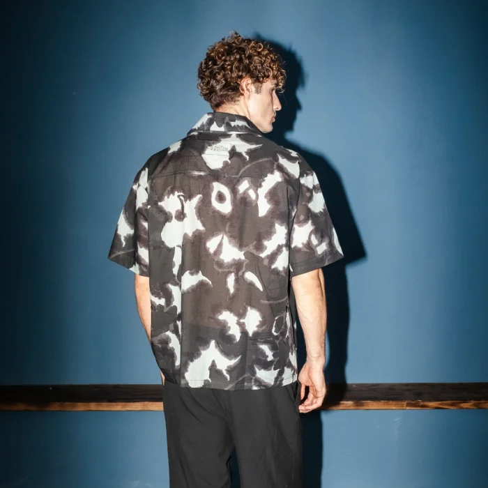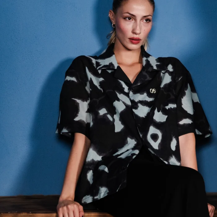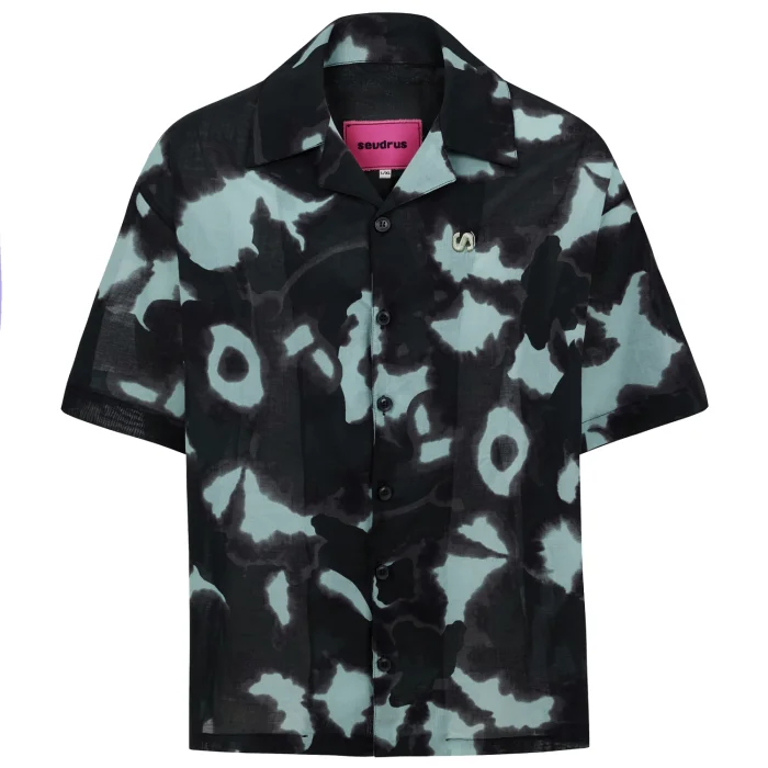 Product Features and Design:  Short-sleeved, anthracite light blue tones patterned fabric, yoke back, oversized cut, embroidered shirt. Embroidery Details: Left chest embossed S  logo and back nape embroidered Sevdrus logo. All designs belong to Sevdrus and are designed exclusively for the collection. Limited edition. Fabric Properties: 100% Cotton            is knitted and produced in Turkey.
