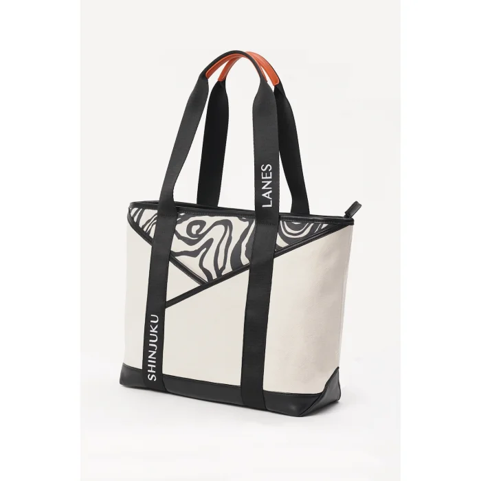 The perfect blend of style and functionality, the Origami Pocket Tote is a spacious bag with a striking, modern design. Crafted from recycled materials, it has a unique front pocket with overlapping folds inspired by traditional Japanese origami. Behind this front pocket is an abstract 'terrain print' evocative of mountain topography. Key features Sustainable: Crafted from recycled cotton canvas and recycled vegan leather Spacious: Comfortably fits a 14" laptop Durable: Strong recycled nylon straps ft. contrasting orange handles Protected: PFC-free nano-coating for water resistance and stain prevention Fully lined: 100% organic cotton lining Multiple pockets: Double front pocket, internal zip pocket and two slip pockets Giftable: Arrives in a Shinjuku Lanes dust bag, made from organic cotton Available in three colours (Natural, Black, Khaki Green).