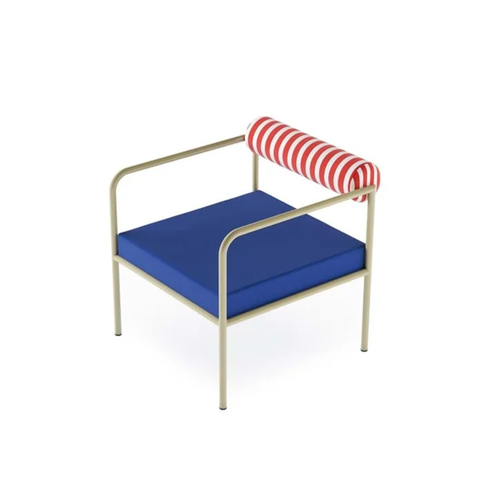 While it offers a soft sitting area with a soft backrest area, its metal structure provides a modern appearance with its geometric structure. It includes striped red, white fabric and dark blue fabric details.