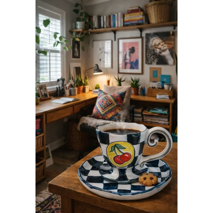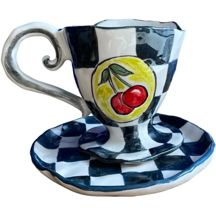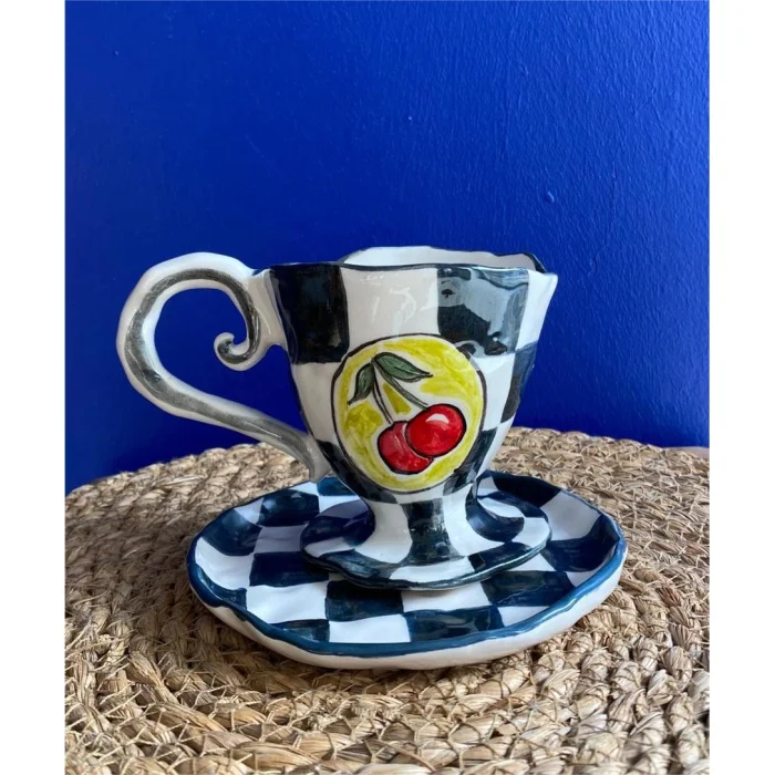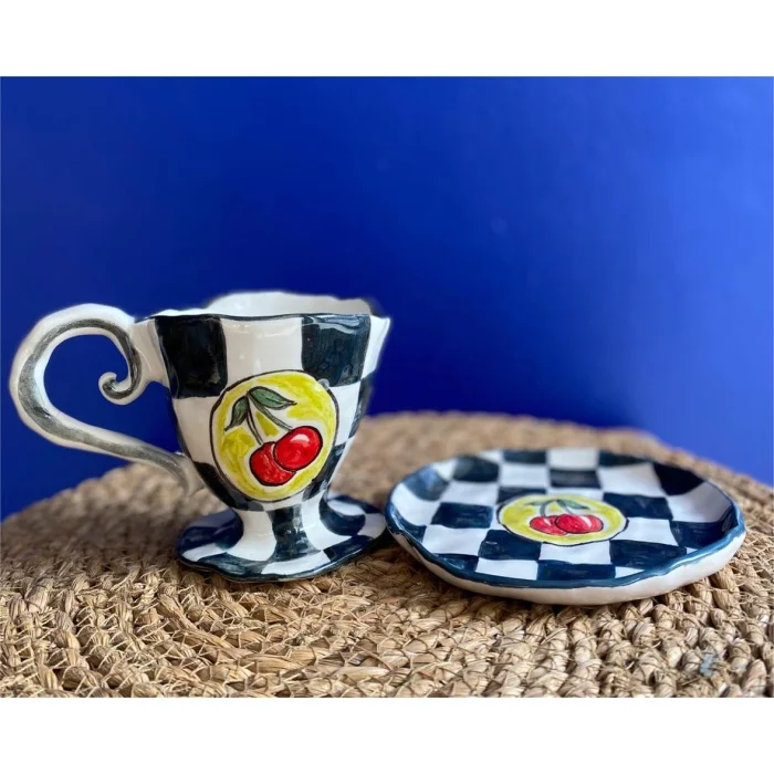 Product: Modern Cherry - Handmade Ceramic Coffee Cup & Saucer