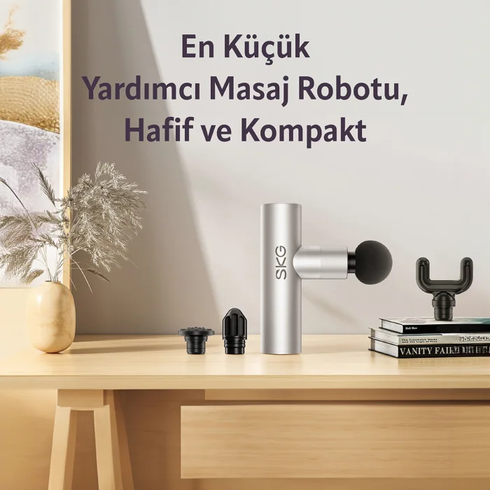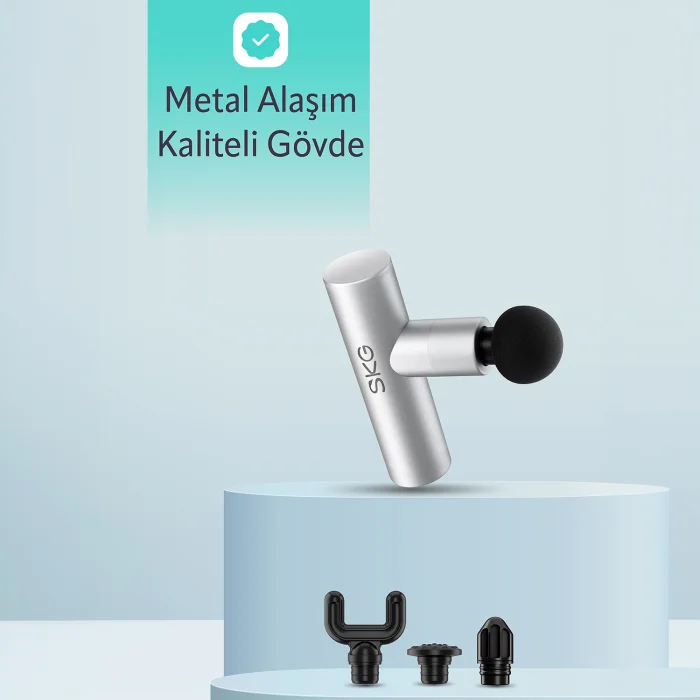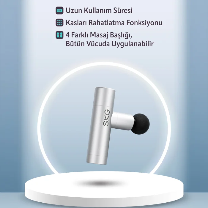 SKG F3 Lite Mini Portable Massage Gun, 4 Different Impact Intensities, 4 Modular Massage Heads Suitable for Different Zones, Ergonomic and Portable Sports Massager, USB-C Charging Port (Silver) The SKG F3 Lite Mini Portable Massage Gun is an ergonomic and portable massager specially designed for athletes and those who work at a busy pace. This device is the perfect solution to relieve muscle fatigue and reduce the stress of everyday life. Thanks to the USB-C charging port, it can be easily charged anywhere and has a sleek design with a silver color. Important Features 4 Different Impact Intensities: Whether you need a light massage or a deep tissue massage, the SKG F3 Lite meets all your needs with different impact intensities. 4 Modular Massage Heads Suitable for Different Zones: A full-fledged massage experience with modular heads, each targeting different muscle groups. Ergonomic and Portable Design: With its light and compact structure, this massage gun that you can carry anywhere is ideal for daily use. USB-C Charging Port: Offers easy and fast charging, so your massage pleasure will never be interrupted. 2.5 Hours Battery Life: Enough battery capacity for long-term use. 7mm Massage Depth: Effectively penetrates your muscles and provides relaxation. Metal Body: The sleek and durable metal body ensures the longevity of the device. Frequently Asked Questions (FAQs) How long can the SKG F3 Lite Mini Massage Gun work? This device can work continuously for 2.5 hours on a full charge. What are the massage intensities of the device? The SKG F3 Lite offers 4 different massage intensities: light, medium, strong and deep tissue massage. For which regions is it suitable? This massage gun is suitable for all body parts, including legs, back, shoulders, neck and arms. How to replace massage heads? Massage heads can be easily attached and removed; Each head is designed to target different muscle groups. How to charge the device? The device can be charged quickly and easily via the USB-C charging port. How is the portability of the device? Thanks to its lightweight and compact design, it can be easily carried and you can take it anywhere. What advantages does the metal body bring? The metal body adds durability and longevity to the device, as well as a stylish appearance. Does the device have a warranty? Yes, the SKG F3 Lite Mini Massage Gun comes with a 1-year warranty. What are the dimensions of the device? The device has a small and portable structure; It is about 15 cm long. How effective is the depth of massage? With a massage depth of 7mm, it penetrates deep into your muscles and provides effective relaxation. How long is the warranty period? 2 Years Technical Specifications Dimensions: 15 cm length Color: Silver Mobile App Compatibility: Yes, it is compatible with certain mobile apps. Plastic Quality: High quality ABS plastic and metal housing Charging Time: 2 hours Battery Life: 2.5 hours of use Massage Depth: 7 mm Operating Temperature: 0°C - 40°C Storage Temperature: -10°C - 50°C Charging Port: USB-C