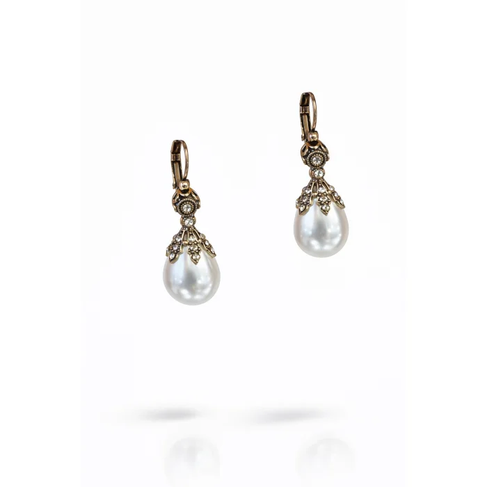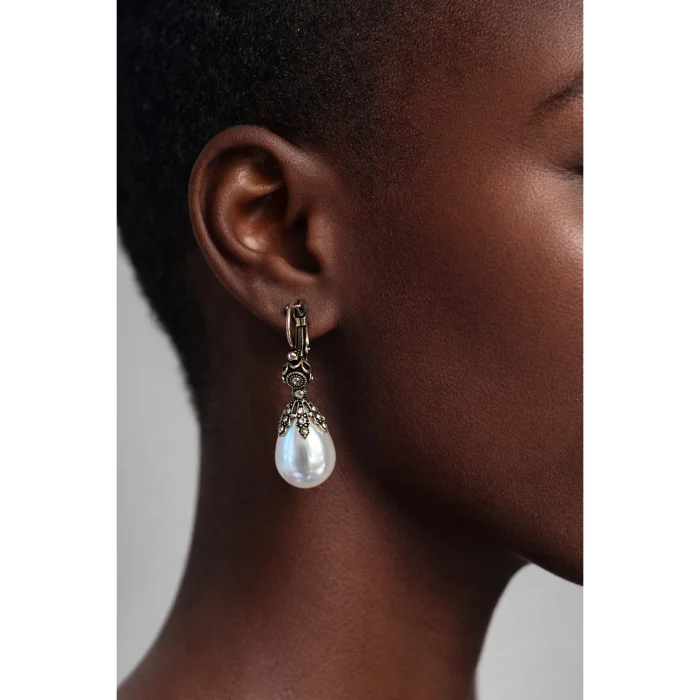 Elegant earrings in the form of drop pearls, designed with Swarovski stone details on bronze material. With its classic craftsmanship and soft sparkle, it reflects the elegance of every era.