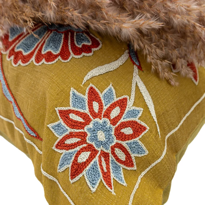 Suzani pillows are one of the traditional Central Asian handicrafts and are usually decorated with colorful silk threads embroidered on cotton or silk fabric. The embroidery often includes traditional motifs such as floral patterns, geometric patterns or animal figures.