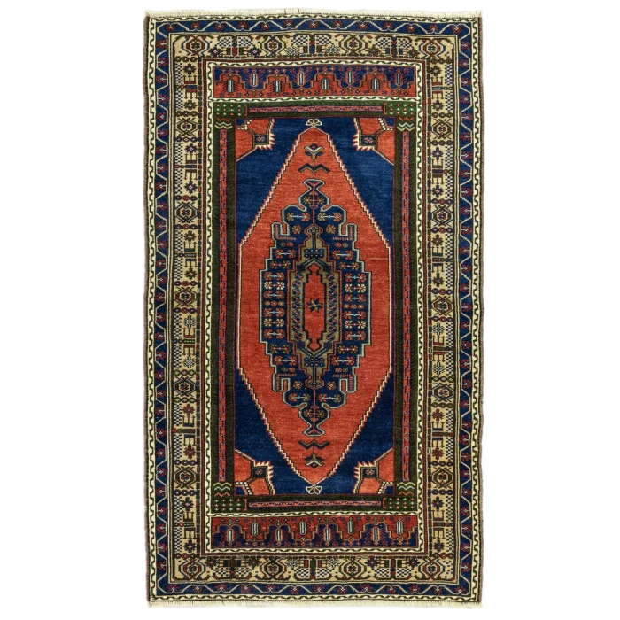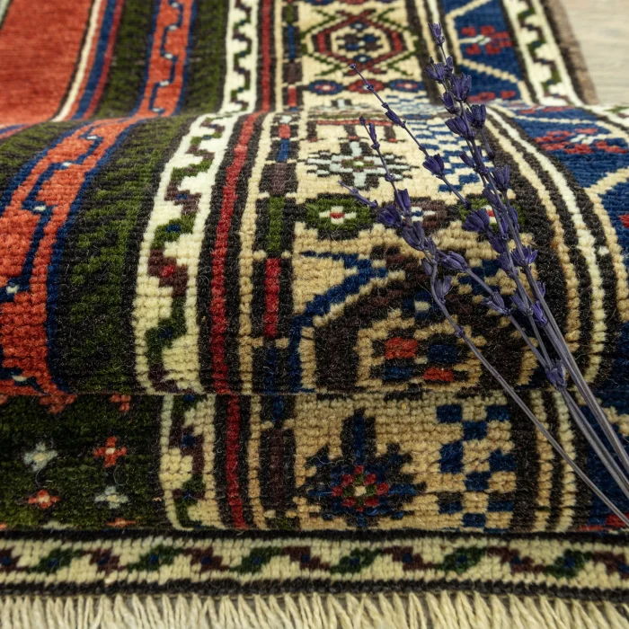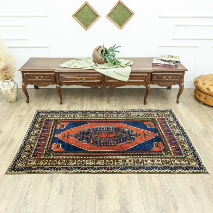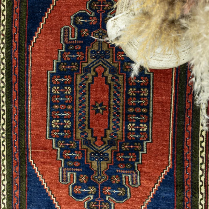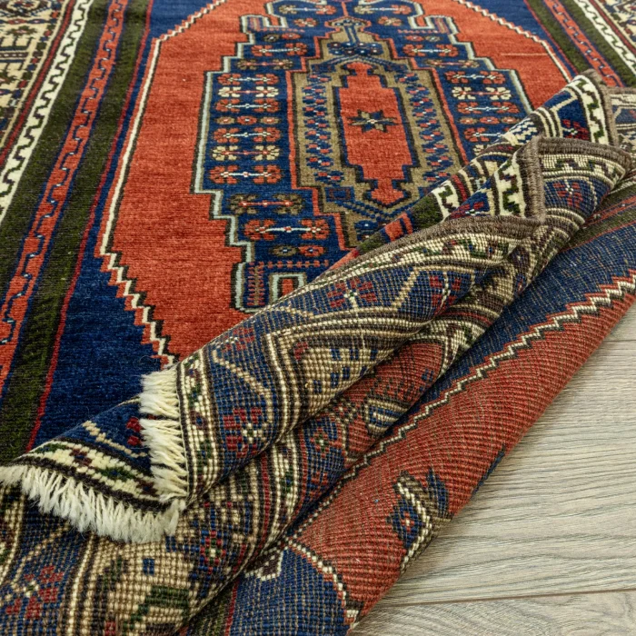 Soho Antiq handwoven carpets and rugs are designed to add a breath of fresh air to your living spaces. This elegant handwoven rug is created by skillfully combining carefully selected high-quality wool yarns. Produced using traditional hand-weaving techniques, the carpet is specially designed to add warmth and elegance to your home. The color palette is inspired by the soft tones of nature, drawing attention with the harmony of red and blue colors while achieving harmony with other colors in the carpet. The rug was carefully woven by experienced artisans and produced in the 1980s with traditional techniques specific to the Taşpınar region of Konya, adding cultural depth to the rug. The size of the rug is measured as 108 x 188 cm, allowing the rug to easily adapt to different living spaces. The thickness of the carpet is between 1 - 3 cm. Beyond its aesthetic value, this handwoven rug excels in adding authenticity and a traditional feel to your home.