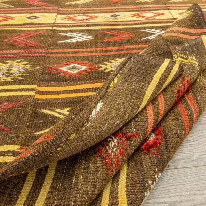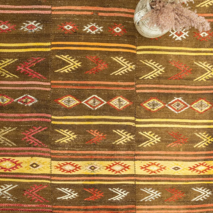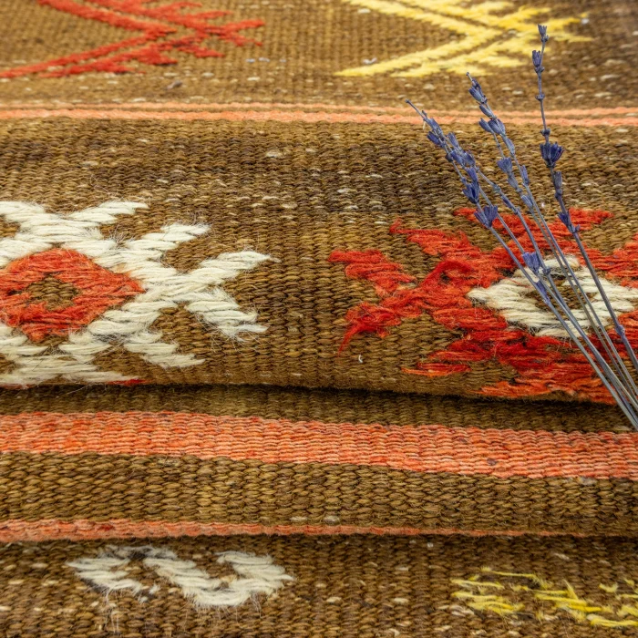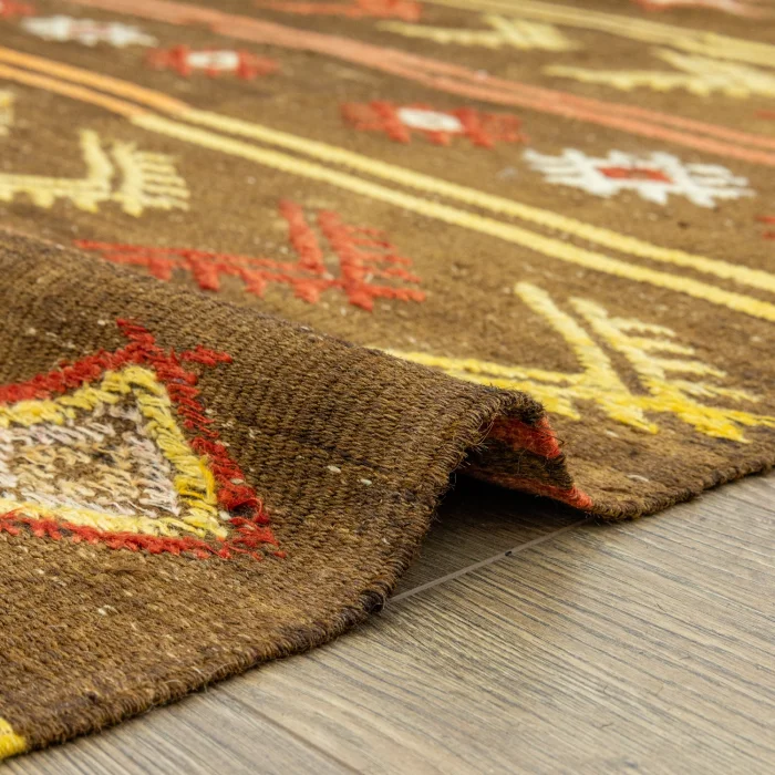 We are here with Soho Antiq traditional and modern rug models that will make a difference to your life! Specially designed to adapt to any space, this rug model is produced using unique handloom techniques and consists of all-natural brown goat hair and wool. This is just one of its many features that make it special. The base color of the rug model is brown, and the other side colors are red and yellow. Thanks to these harmonious colors, you meet with an aesthetic rug. This rug is prepared with the twine weaving technique. In the twine weaving technique, there are reliefs as if embroidered with a needle. This rug, which is also called three wings, was woven into three separate pieces and then combined. The dimensions of the rug are 170 x 389 cm, and the thickness is approximately 1-3 cm. With Soho Antiq, you can experience traditional touches. The design of this carpet was inspired by the Anatolian region and especially has the aesthetic features of the 1970s. Hand-woven carpet and rug models can cause wear over time. However, contrary to popular belief, this makes carpets and rugs look better quality. Worn, handwoven carpets and rugs are long-lasting and increase in value as time goes on. In addition, hand-woven carpets and rugs, which change their appearance, can add difference to the environment they are in! Hand-woven custom rugs produced with Soho Antiq quality are an ideal choice for those who love naturalness and originality. If you want to add a special touch to your home, you can choose one of our hand-woven rugs.