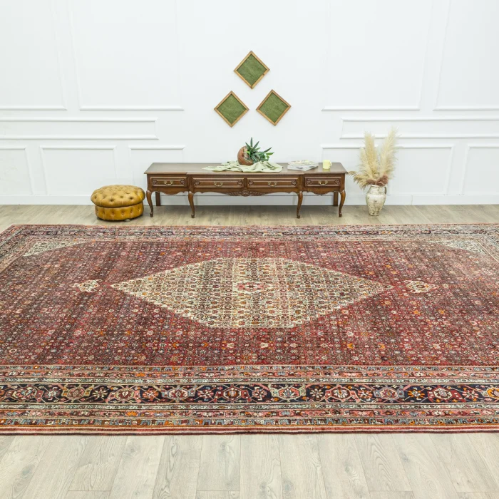 Soho Antiq handwoven carpets and rugs are designed to add a breath of fresh air to your living spaces. This elegant handwoven rug is created by skillfully combining carefully selected high-quality wool and cotton yarns. Produced using traditional hand-weaving techniques, the carpet is specially designed to add warmth and elegance to your home. The color palette is inspired by the soft tones of nature and draws attention with the harmony of burgundy and beige colors while achieving harmony with other colors in the carpet. The rug was carefully woven by experienced artisans and produced in the 1970s using traditional techniques specific to the Iranian region, adding cultural depth to the rug. The size of the rug is measured as 335 x 542 cm, allowing the rug to easily adapt to different living spaces. The thickness of the carpet is between 1 - 3 cm. Beyond its aesthetic value, this handwoven rug excels in adding authenticity and a traditional feel to your home.