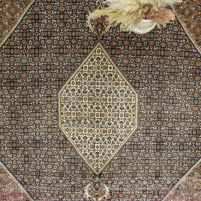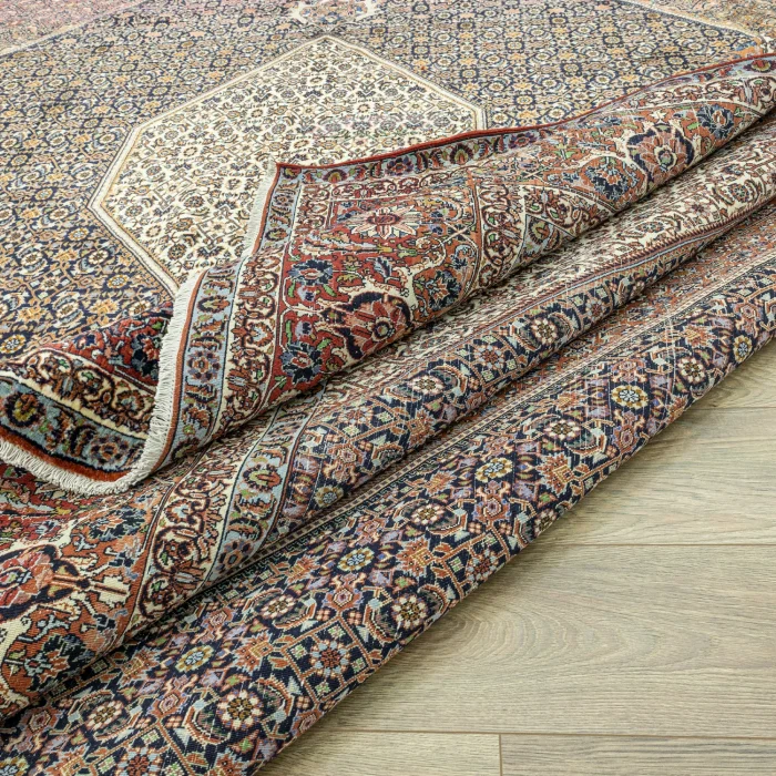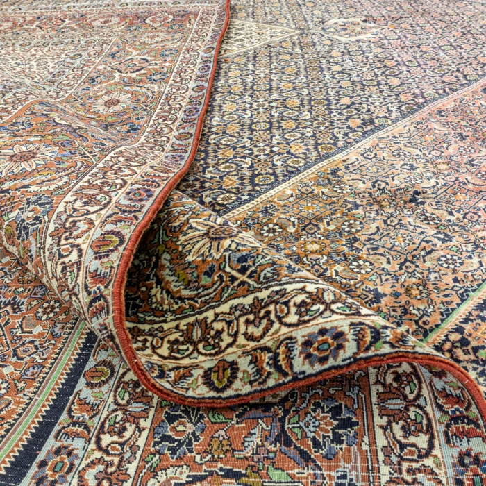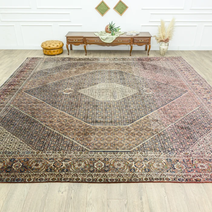 Soho Antiq handwoven carpets and rugs are designed to add a breath of fresh air to your living spaces. This elegant handwoven rug is created by skillfully combining carefully selected high-quality wool and cotton yarns. Produced using traditional hand-weaving techniques, the carpet is specially designed to add warmth and elegance to your home. The color palette is inspired by the soft tones of nature, drawing attention with the harmony of navy blue and red colors while achieving harmony with other colors in the carpet. The rug is carefully woven by experienced artisans and produced in the 1980s using traditional techniques specific to the Iranian region, adding cultural depth to the rug. The size of the rug is measured as 396 x 407 cm, which allows the rug to easily adapt to different living spaces. The thickness of the carpet is between 1 - 3 cm. Beyond its aesthetic value, this handwoven rug excels in adding authenticity and a traditional feel to your home.