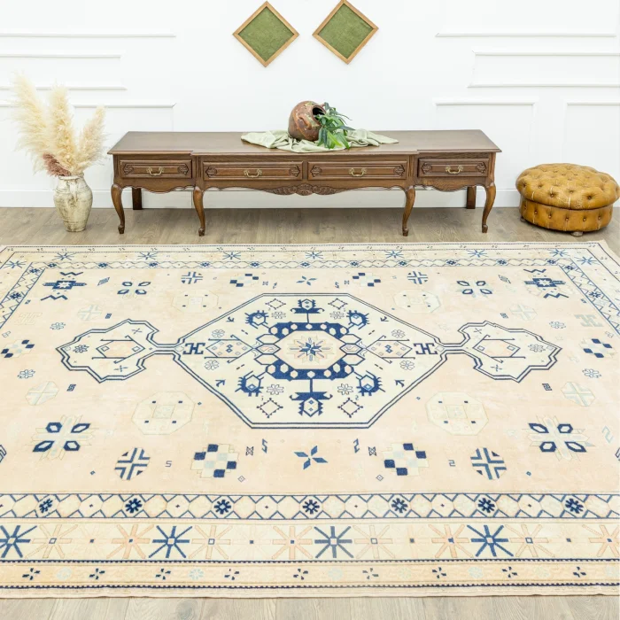 Soho Antiq hand-woven carpets and rugs are designed to breathe into your living spaces. This exquisite hand-woven rug is created by expertly combining carefully selected high-quality wool yarns. Produced using traditional handloom techniques, the carpet is specially designed to add warmth and elegance to your home. The color palette is inspired by the soft tones of nature, and while the kitten draws attention with the harmony of pastel pink and blue colors, it catches harmony with other colors in the carpet. The carpet was carefully woven by experienced handicraftsmen and produced in the 1990s with traditional techniques unique to the Uşak region, which adds a cultural depth to the carpet. The size of the carpet is measured as 257 x 345 cm, which allows the carpet to easily adapt to different living spaces. The thickness of the carpet is between 1 - 3 cm. Beyond its aesthetic value, this hand-woven rug stands out when it comes to adding authenticity and a traditional feel to your home.