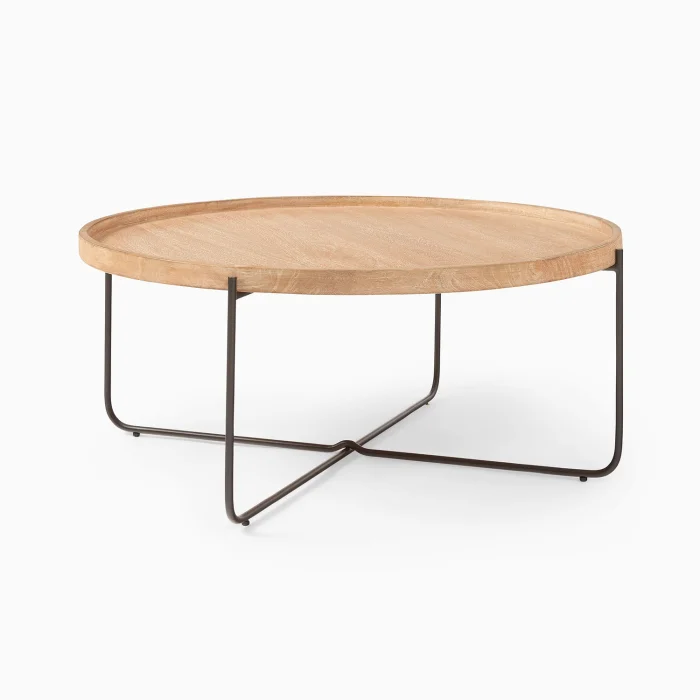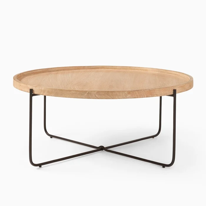 The product is made of solid panel wood and compressed wood veneer. Its metal leg is black oven painted. Product dimensions including metal frame: Diameter 70 cm, height 37 cm.Product: Natural Wood Color Solid Coffee Table
