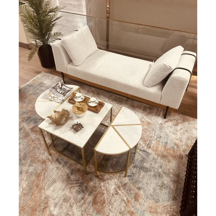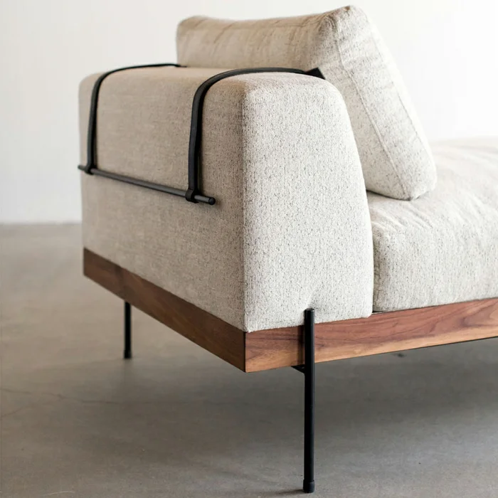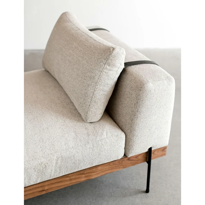 Hornbeam wood was used in the skeleton of the product, walnut-colored varnish was applied. Cushions and pillows are made of 1, class, 28 DNS sponge and wipeable linen fabric. It has dimensions of 200x80x75 cm. Its legs are oven-painted metal.