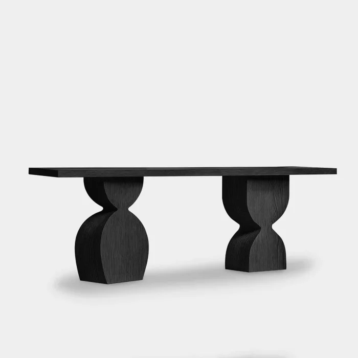 Silhouette – Wooden Console An elegant combination of art and functionality. Our "silhouette" table gives the space a strong yet simple statement with its sculptural leg form and dark-toned natural wood texture. With its curved forms that go beyond the classical lines, it exhibits both a sculptural and architectural stance. Made of solid wood, the silhouette has a deep texture thanks to the special sandblasting process applied on its surface. This technique highlights the natural traces of the tree, adding character and a sense of liveliness to the surface. Every handcrafted detail reveals the uniqueness of the product. Whether you use it as a console, workspace, or meeting space; The silhouette is designed to add soul to your living spaces with both aesthetic and functional aspects. Nature-inspired lines, crafted texture and timeless simplicity... Meet this unique piece that reflects the modern bohemian spirit of Sohomanje. Hornbeam wood is used. It measures 160*40*85(h).