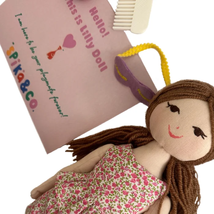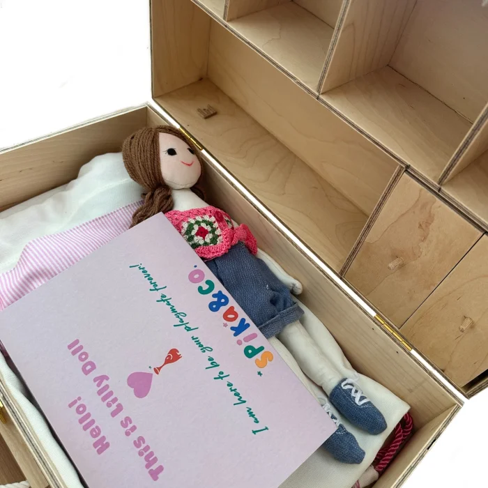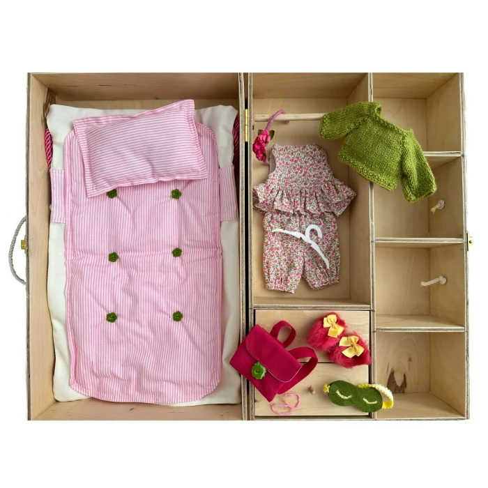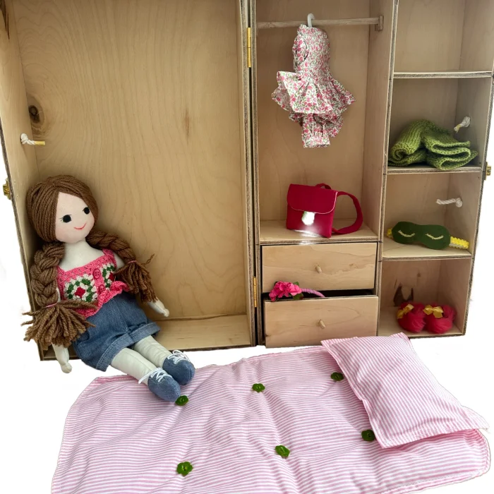Lilly Doll comes with her outfit in a backpack that children can use. The bag is also Lilly Doll's bed. Inside the bag, her pajamas, comb, hair clips, hanger and pillow come out. All of these are in a wooden box. The box can be Lilly Doll's wardrobe and bed at the same time.