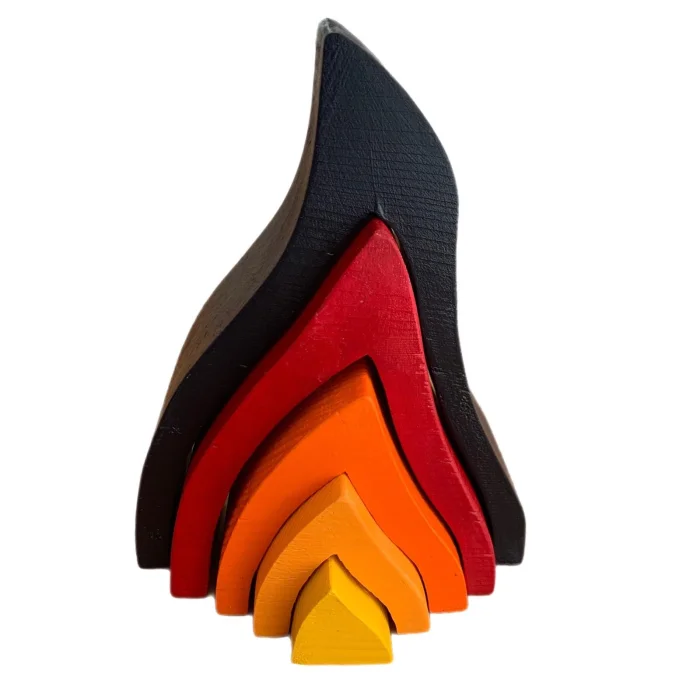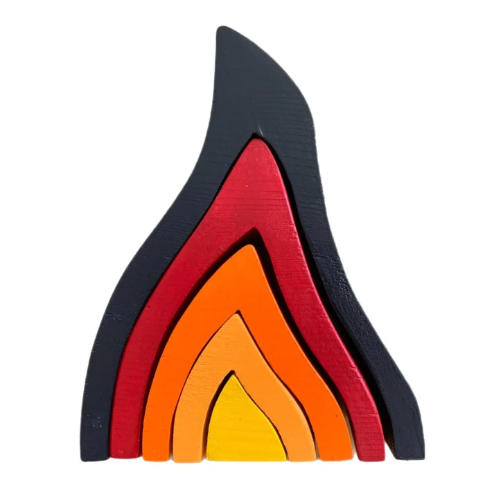 The 5-flame, completely handmade, is crafted from beechwood. The flame, painted child-safely, features yellow, melon, orange, red, and dark brown. It encourages children to use their imaginations and play.