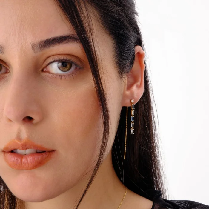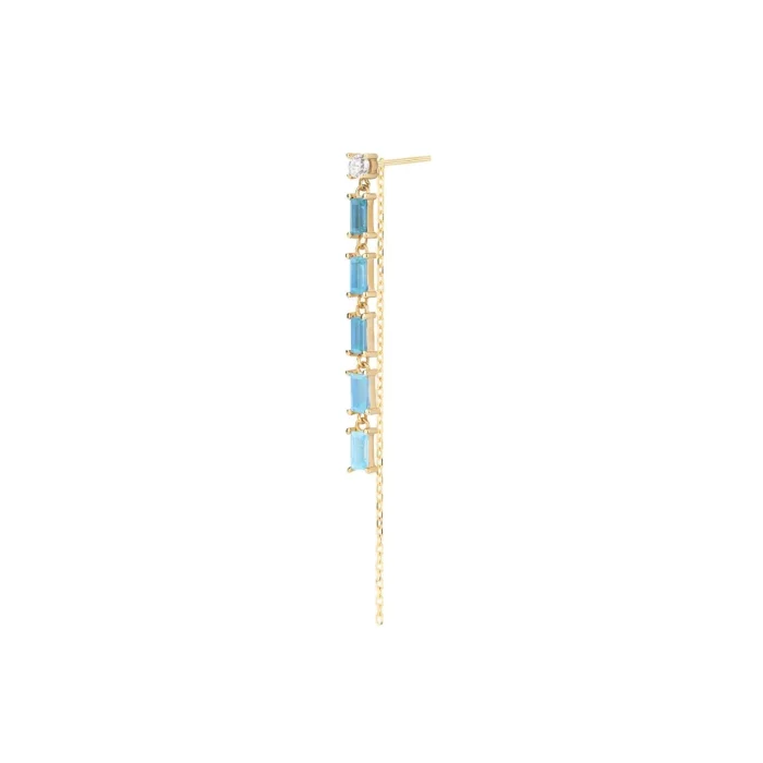 14k Micron Gold Plated on 925 Silver. Blue Topaz 0.70ct, Zircon. Silver Weight: 1.00 g. Length: Stone 3.3 cm. Chain 5.5 cm. These earrings are sold individually. The product is certified.
