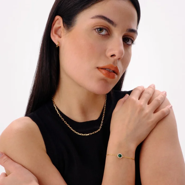 14k Micron Gold Plated on 925 Silver. Malachite Enamel, Zircon. Silver Weight: 1.75 g. Wristband Tip Diameter: 10 mm. Chain Length: 17 cm. The product is certified.