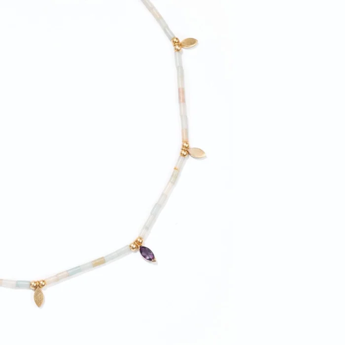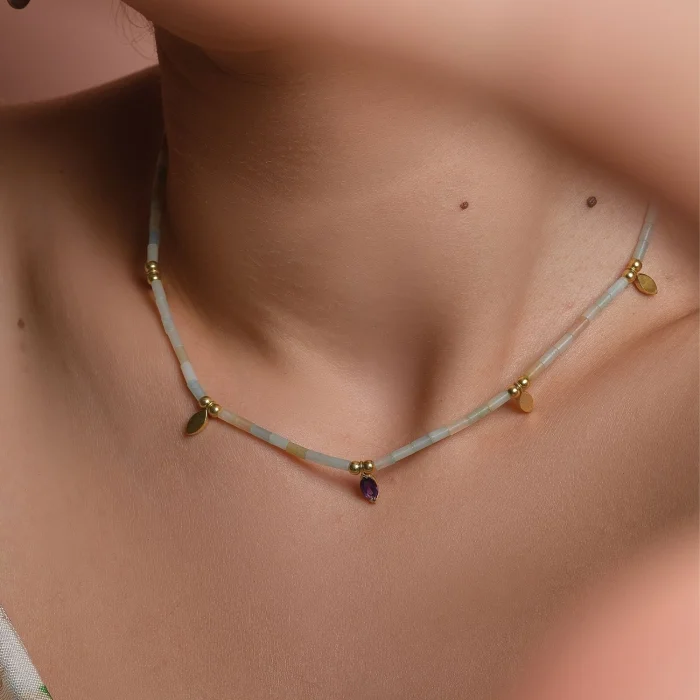 14k Micron Gold Plated on 925 Silver. Amazonite, Amethyst: 0.28 ct. Silver Weight: 2.30 g Length: 42 cm. The product is certified.