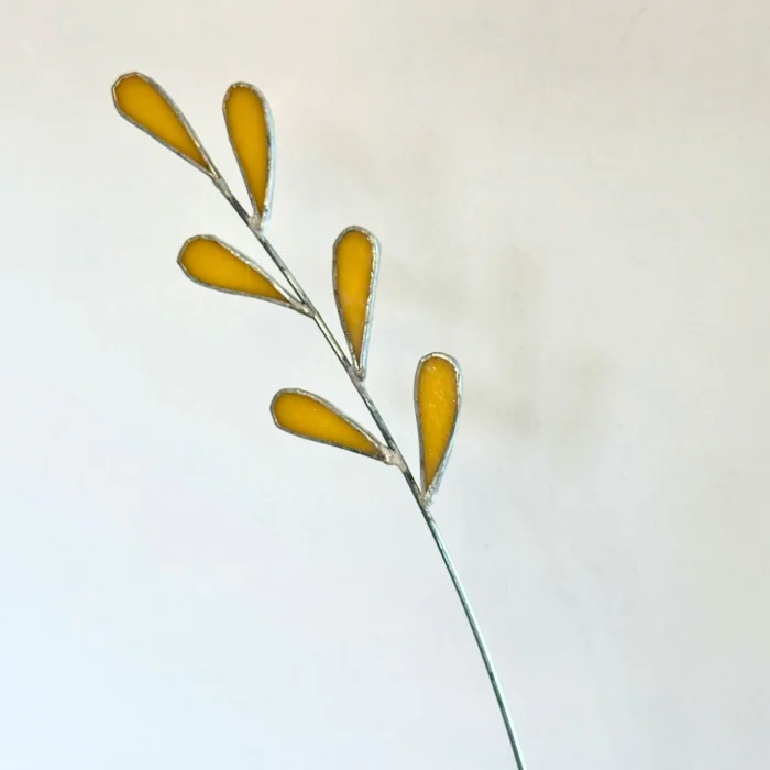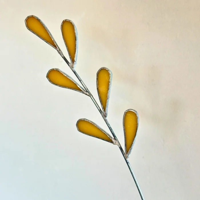 Amber carries the soft glow of nature into your living space with its elegant teardrop shapes and warm amber tones. Each stained glass piece is hand-shaped and joined with a slender metal stem, creating a quiet and minimalistic composition.