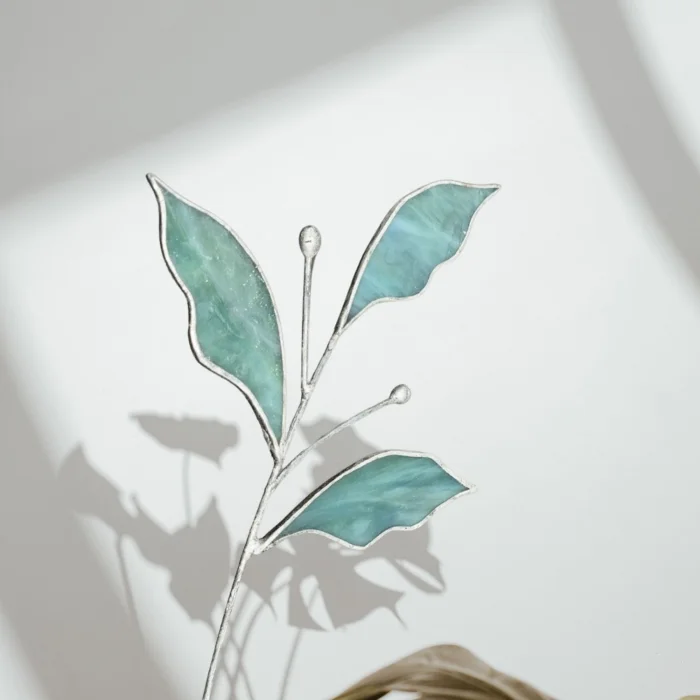 Zümrüt brings the balanced beauty of nature to life through its large green leaves and delicate budding details. Each element is carefully handcrafted from stained glass and joined with a slender soldered metal stem.
