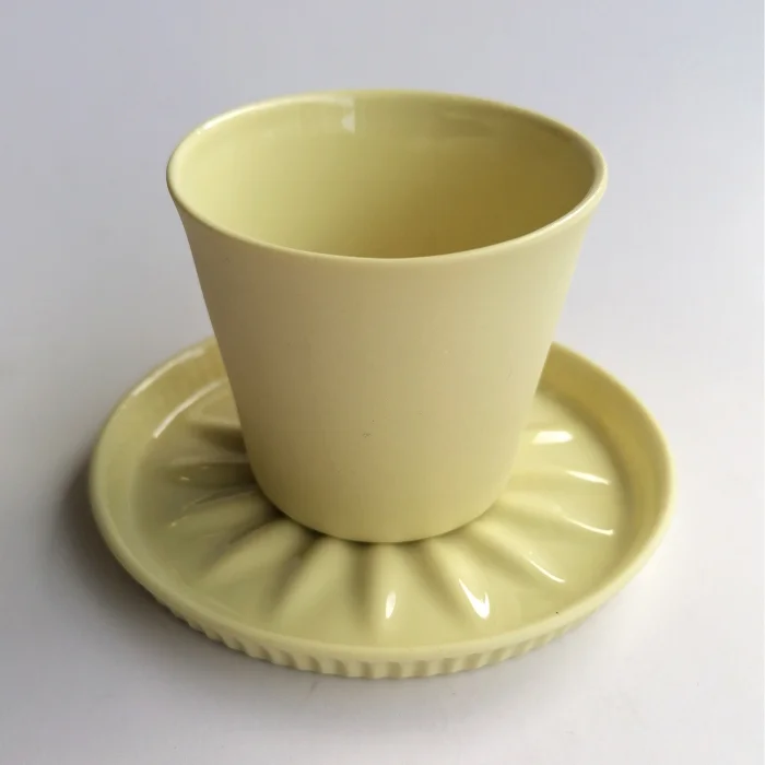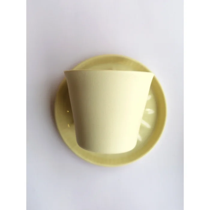 It's handmade fine porcelain. The inner surface of the glass is colored glaze and the outside is unglazed. Each product is hand drawn.