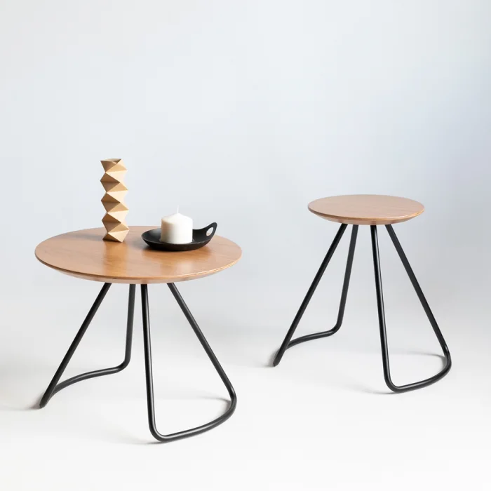 This product can be used as a stool and/or a side table and is handmade by wood and metal artisans. Seating: Oak veneer on birch plywood. Legs: Bent metal tube with electrostatic paint. Designer: Fulden Topaloğlu
