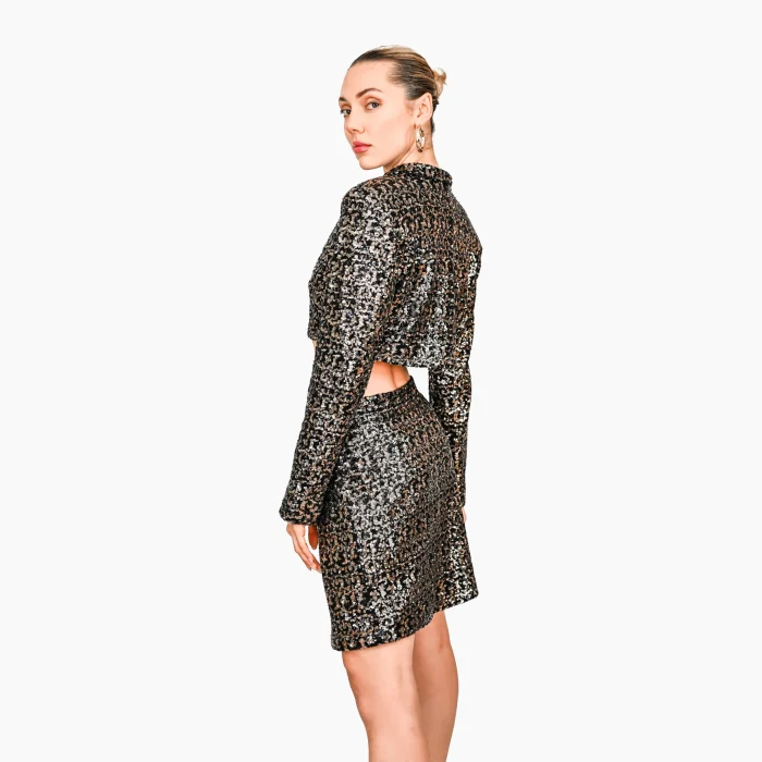 Front-buttoned cropped jacket and mini skirt made from shiny sequined fabric. Made from 100% polyester, sequined fabric. Both the jacket and skirt feature button details. The outfit worn by the model is size S. The product is available in the desired color and size.