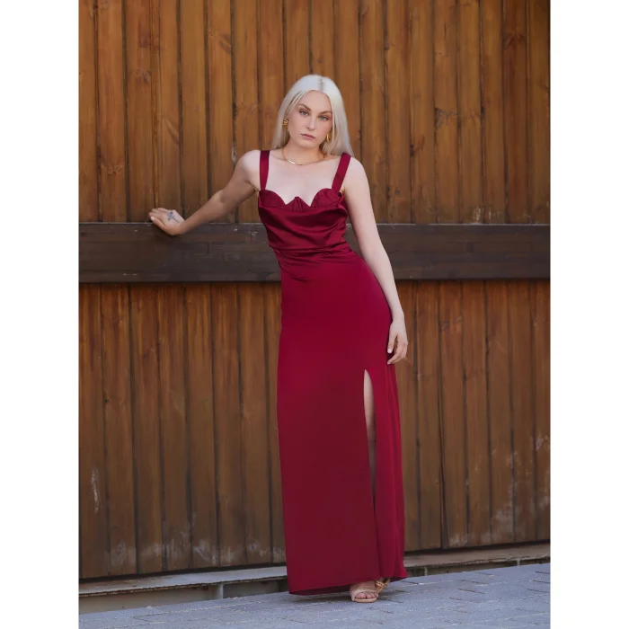 Lace detailed bustier maxi satin dress. Made from 100% polyester fabric. The dress worn by the model is size S. The product is available in the desired color and size.