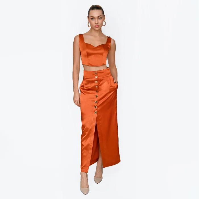 Gold button-detailed, back-zip cropped blouse & pocketed maxi skirt. Made from 100% polyester, crepe satin fabric. The blouse and skirt feature gold button details. The outfit worn by the model is size S. The product is available in the desired color and size.
