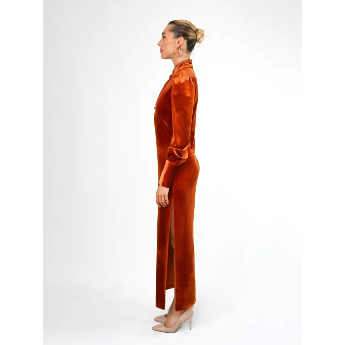 Back-zip maxi dress made from velvet fabric with a deep side slit. Made from 100% polyester, velvet fabric. The dress features stripe details at the bust and neckline. The dress worn by the model is size S. The product is available in the desired color and size.