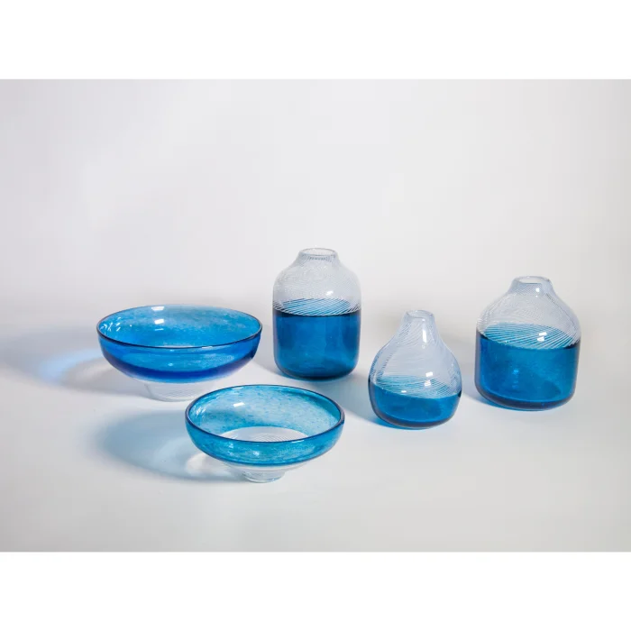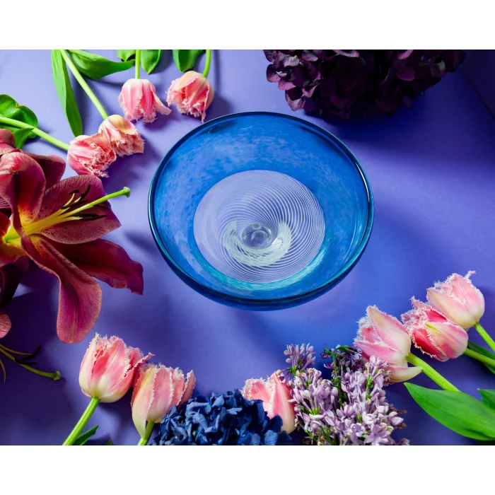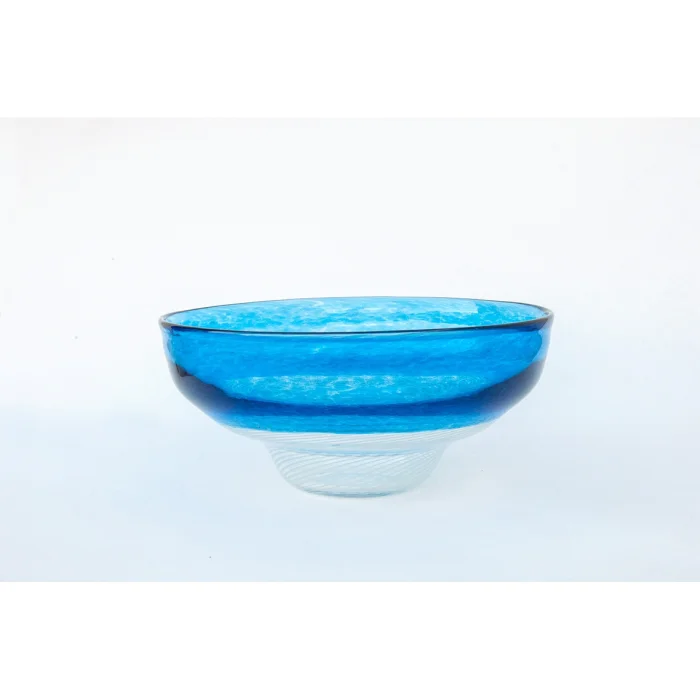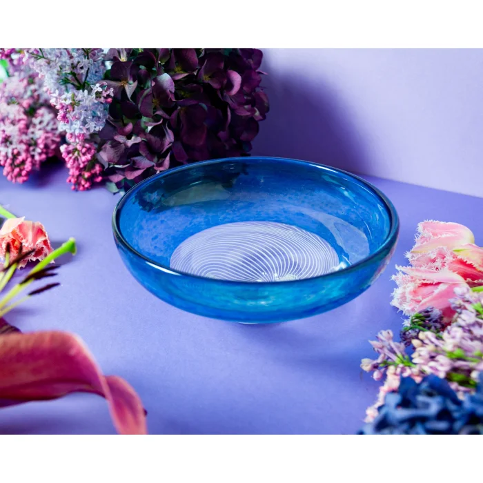 White striped and blue hand-blown small bowl with incalmo and Ceşm-i Bülbül technique