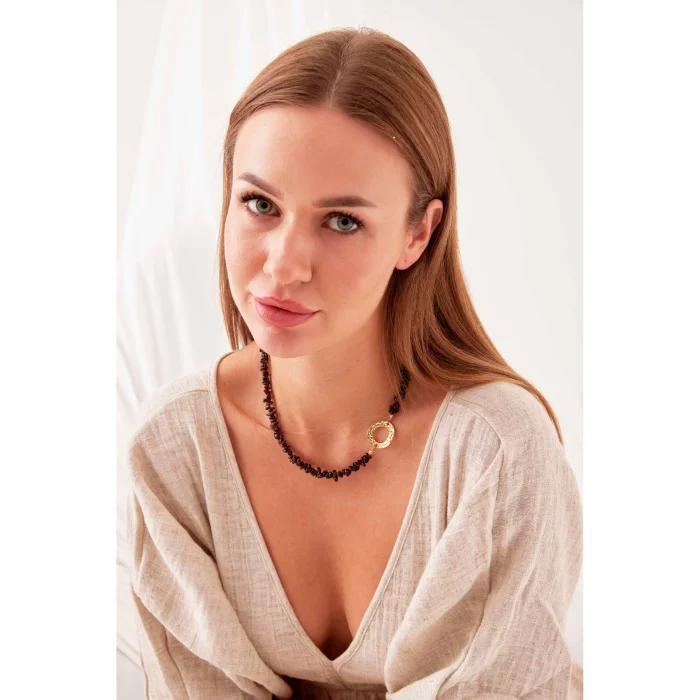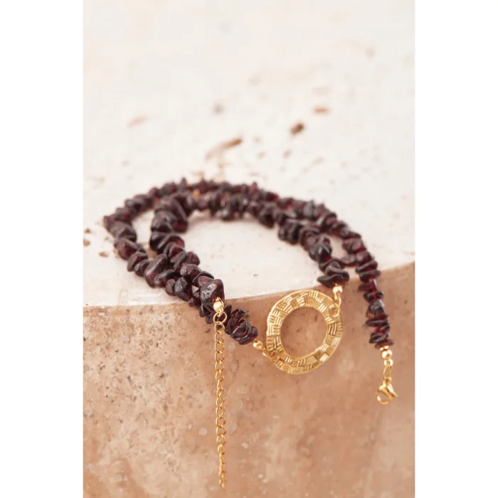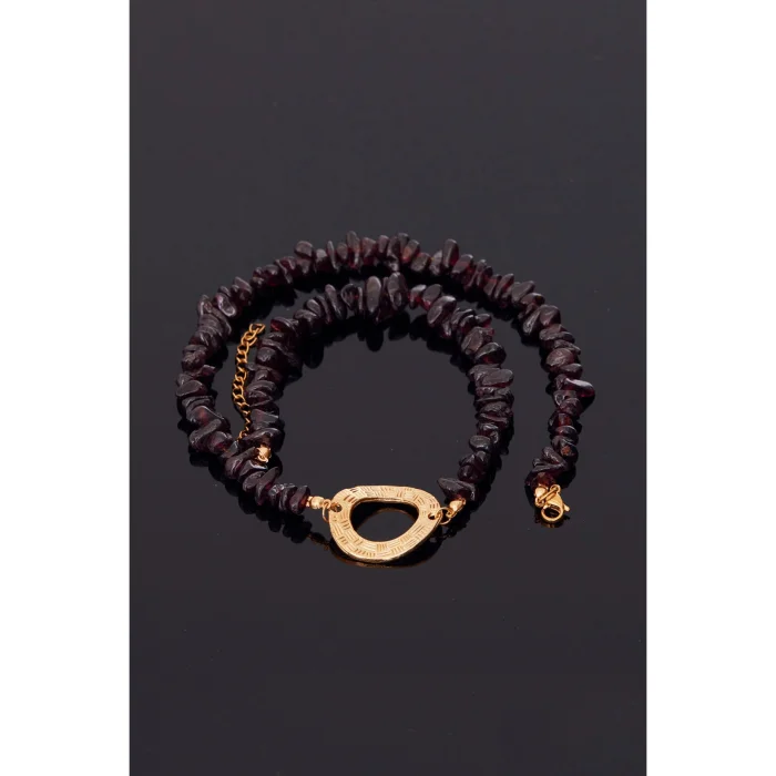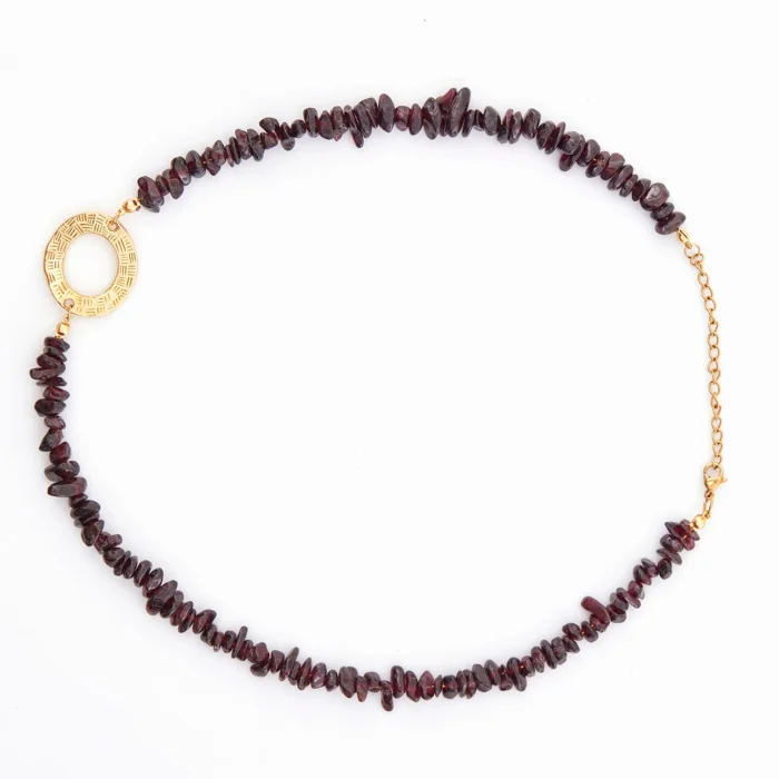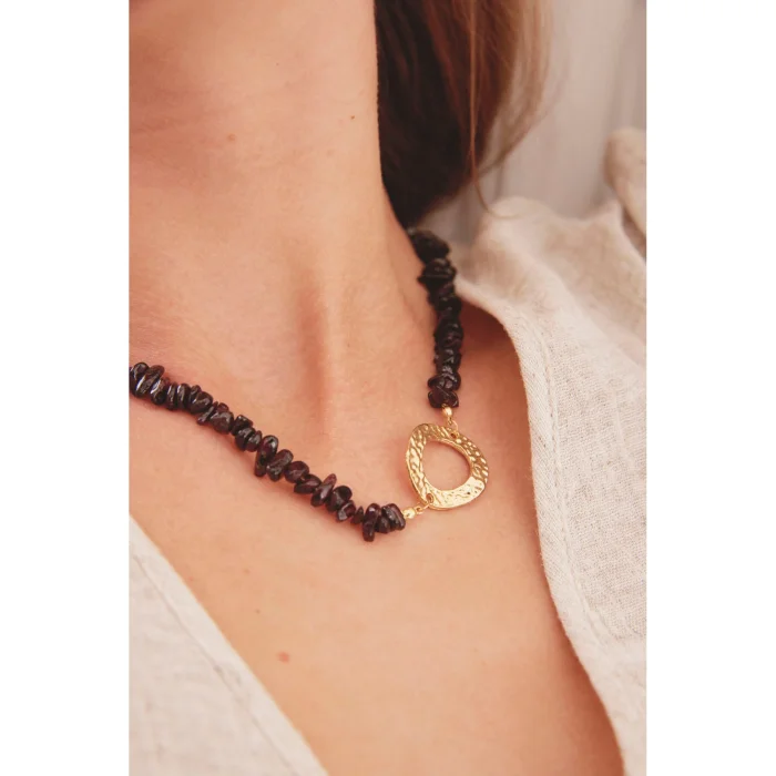 Belatrix Necklace is handmade and designed from garnet garnet stone. In addition, steel and 24 K gold plated apparatus were used in its construction.