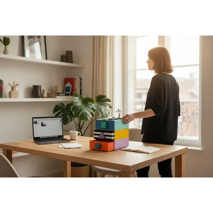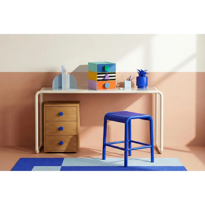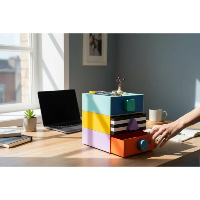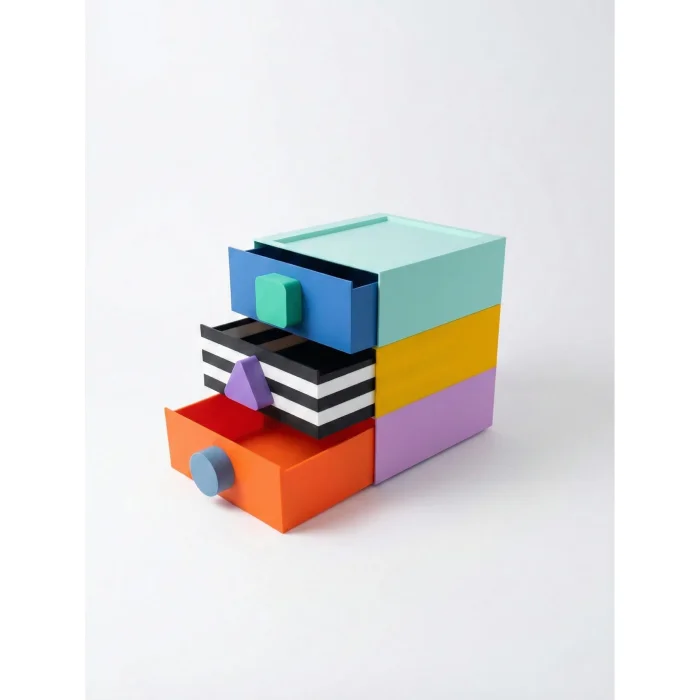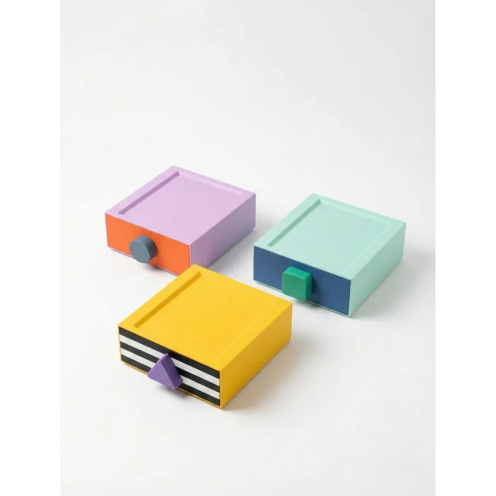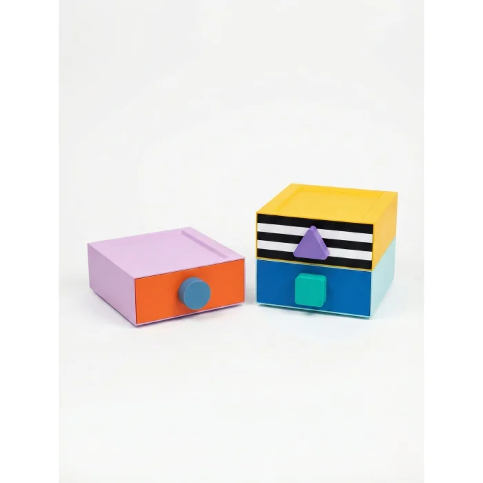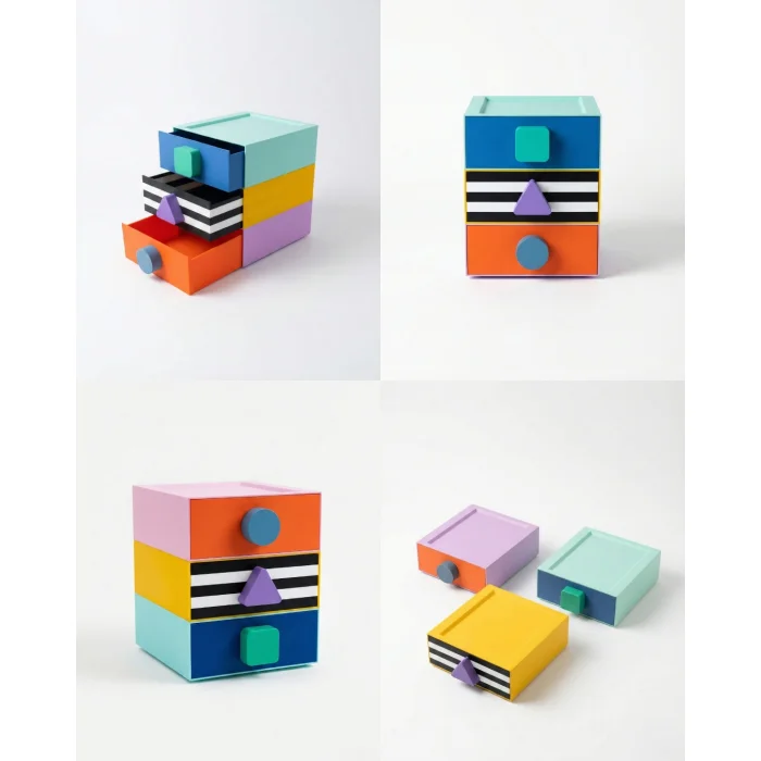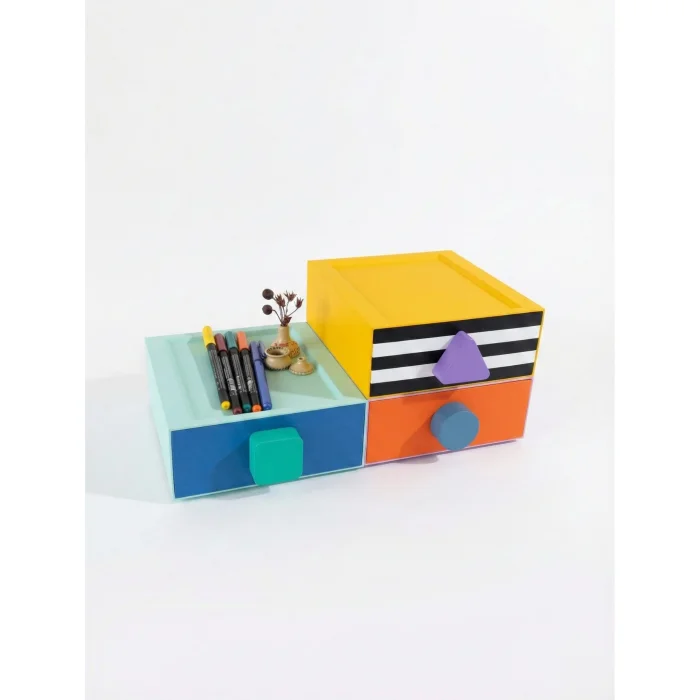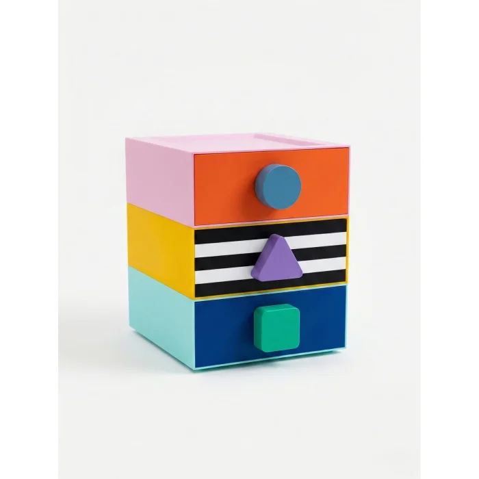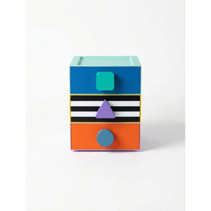 This 3-drawer box set is designed to instantly add a pop of color and joy to your desk, in front of your vanity mirror, or any corner of your home. Combining different colors, fun patterns and handles in various geometric shapes, this set is not only an organizer, but also a decoration object that will open your heart as you look at it.