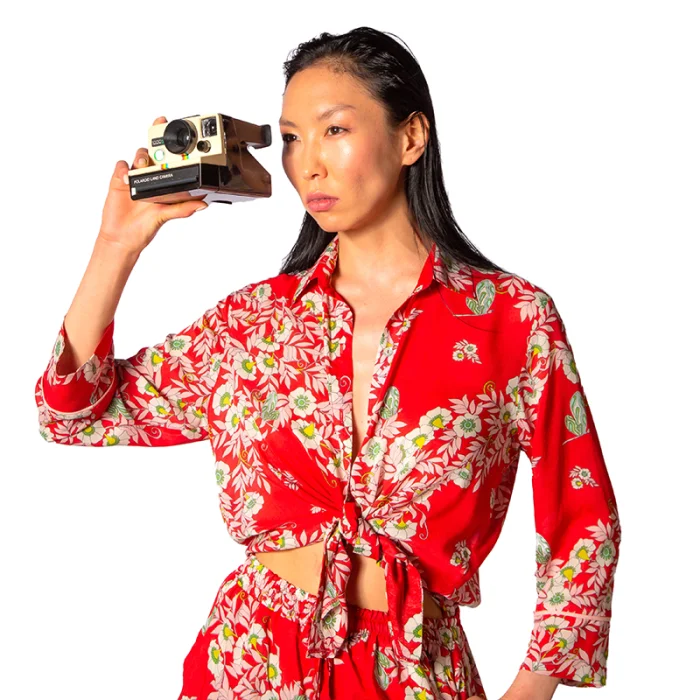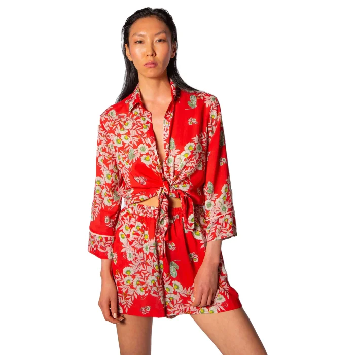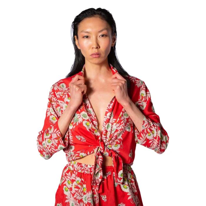 Joy Flower Long Sleeve Collar Detailed Patterned Red Shirt