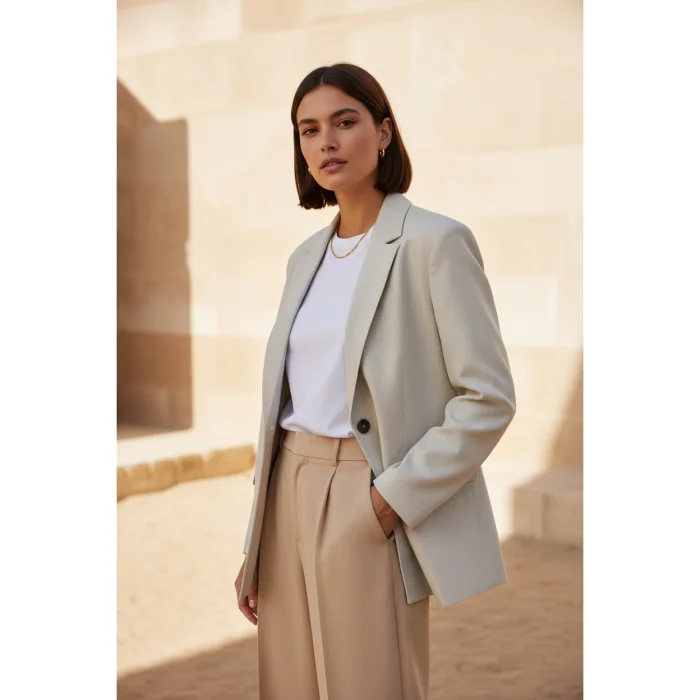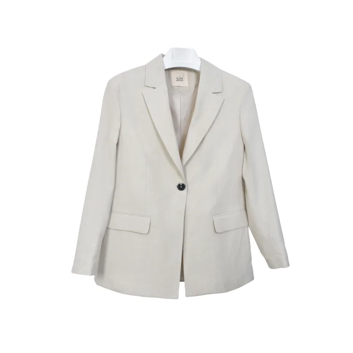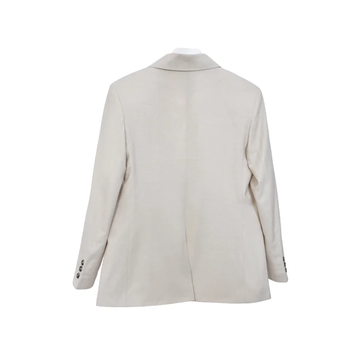 It offers a simple yet powerful style in the beige blazer jacket category.