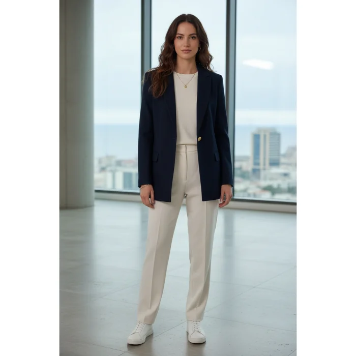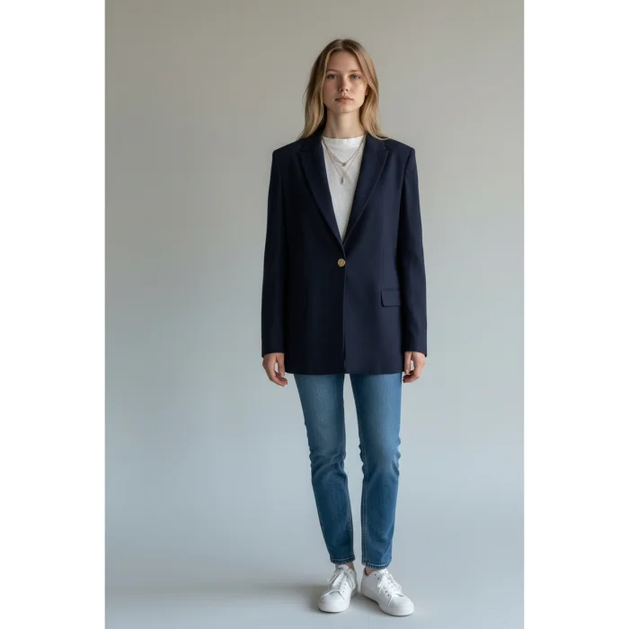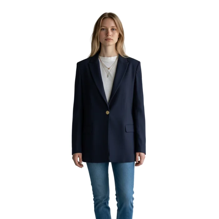 Offering a timeless alternative in the navy blue blazer jacket category, the model is designed for those who want to complete elegance with a minimal touch.
