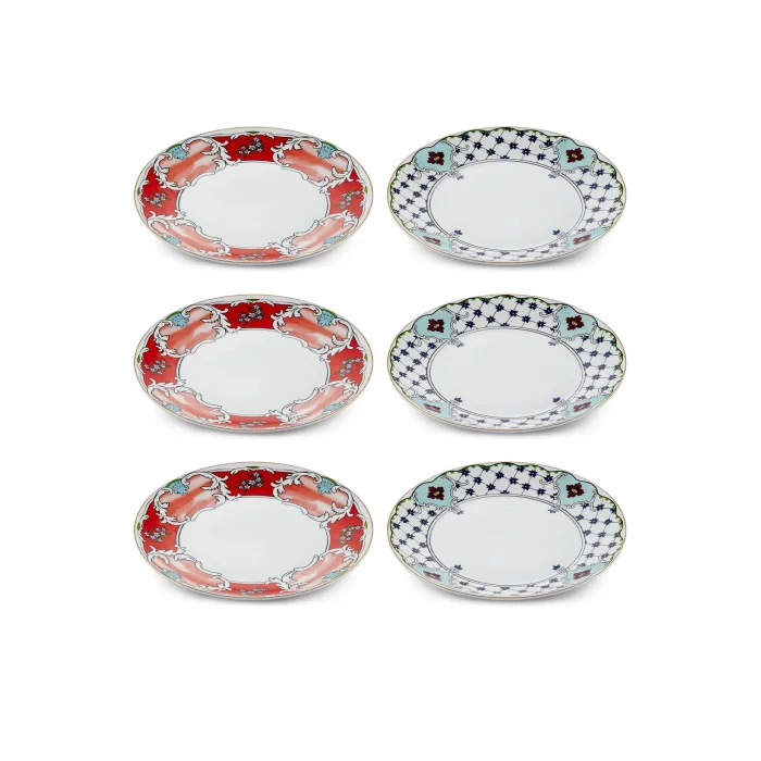 It is made of New Bone China Porcelain. Set Contents; 6 Pieces Cake PlateProduct size: 21 cmSuitable for dishwasher use. The Amore Series Cake Plate, which will make your presentations more elegant and encourage your guests, will be the dazzling detail of the tables. With its pattern and stylish colors, it will add nobility to your tables. These cake plates, which allow you to set stylish tables, will also be a pleasant gift for your loved ones who pay attention to every detail.