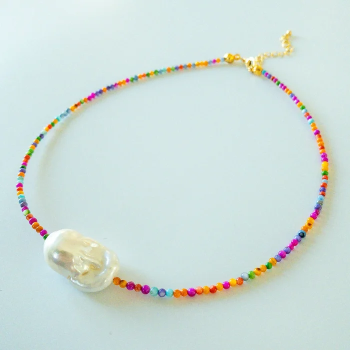 Combining the reflections of nature with a modern elegance, this necklace was inspired by the natural harmony of colorful mother-of-pearl and baroque pearls. Baroque pearls are a symbol of originality with their organic forms that go beyond the classical understanding of symmetry. Each of them adds individuality, elegance and naturalness to the design with its unique structure. Colored mother-of-pearl, on the other hand, draws attention with its tones that change according to the light. Associated with calmness, inner balance, and spiritual clarity, this stone gives its appearance a soft yet expressive glow. This special necklace; With the combination of soft color transitions, natural glitters and original forms, it offers an elegant touch to both daily and special combinations. A simple but characterful design with a modern interpretation of naturalness.