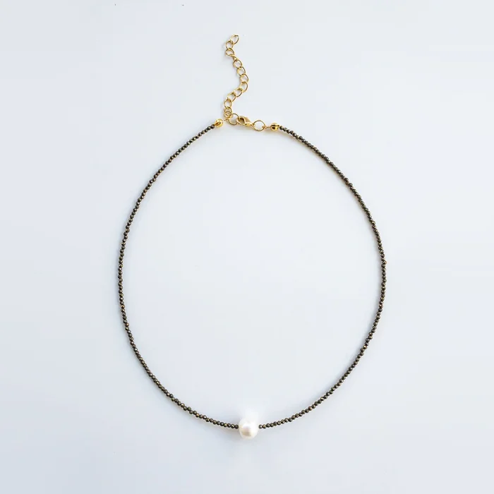 10 -11 mm baroque pearl and 2 mm facet cut pyrite stones.