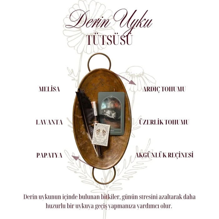 Deep sleep incense, which is included in the ritual incense series, is a product prepared with 100% natural plant mixtures and does not contain chemicals, essences and synthetic substances. The plants in deep sleep help you transition to a more peaceful sleep by reducing the stress of the day. This incense is a mixture that you can safely use whenever you need it.